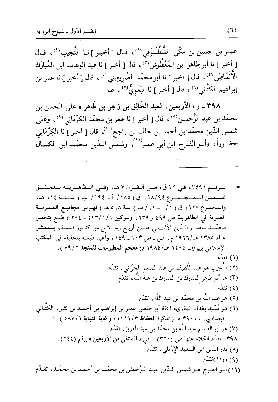 398 - و"الأربعين لعبد الخالق بن زاهر بن طاهر" على الحسن بن محمد بن عبد الرحمن قال [أخبر] نا عمر بن محمد الكرماني وعلى شمس الدين محمد بن أحمد بن خلف بن راجح قال [أخبر] نا الكرماني حضوراً وأبو الفرج ابن أبي عمر وشمس الدين محمد ابن الكمال