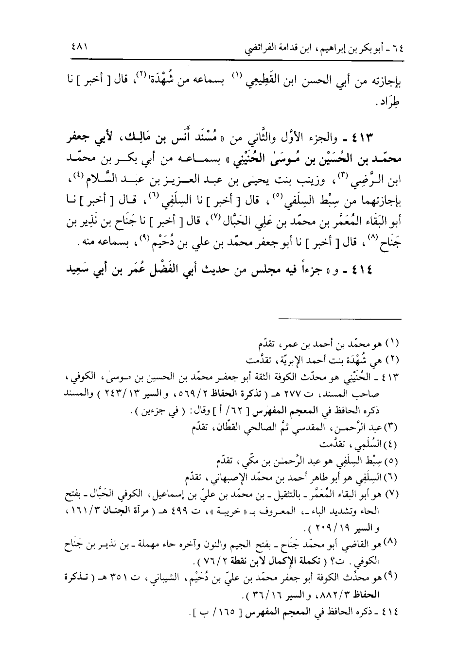 بإجازته من أبي الحسن ابن القطيعي بسماعه من شهدة قال [أخبر] نا طراد. 413