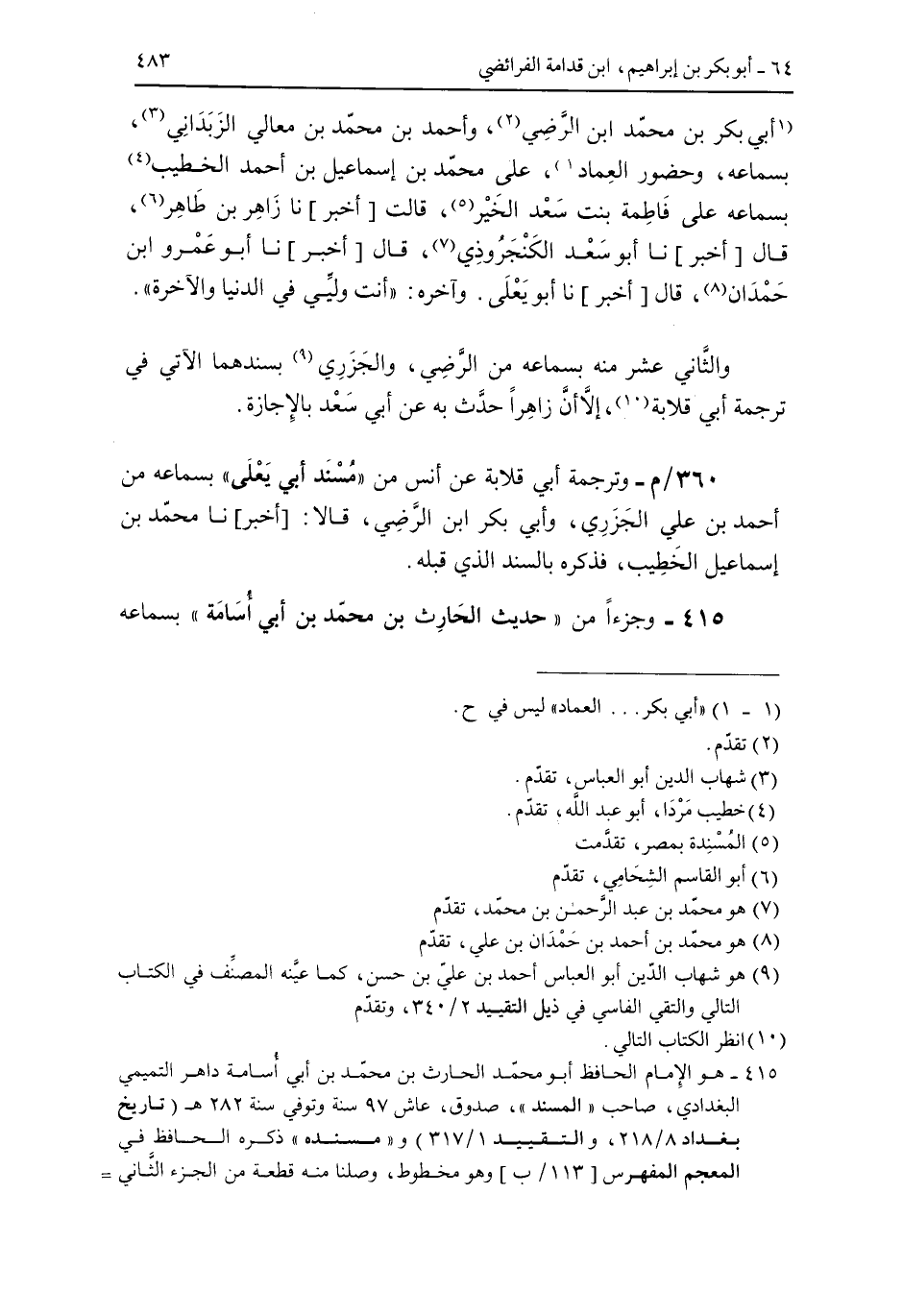 360/م- وترجمة أبي قلابة عن أنس نت "مسند أبي يعلى" بسماعه من أحمد بن علي الجزري وأبي بمر ابن الرضي قال: [أخبر] نا محمد بن إسماعيل الخطيب فذكره بالسند الذي قبله.