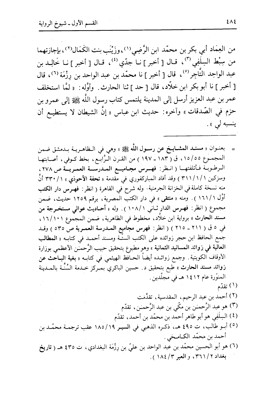 من العماد أبي بكر بن محمد ابن الرضي وزينب بنت الكمال بإجازتها من سبط السلفي قال [أخبر] نا جدي قال [أخبر] نا خالد بن عبد الواحد التاجير قال [أخبر] نا محمد بن عبد الواحد بن رزمةقال [أخبر] نا أبو بكر ابن خلاد قال [حد] ثنا الحارث. وأوله: "لما استخلف عمر بن عبد العزيز أرسل إلى المدينى يلتمس كتاب رسول الله صلى الله عليه وسلم إلى عمرو بن حزم في الصدقت" وآخره: حديث ابن عباس "إن الشيطان لا يستطيع أن ينسبه لي"