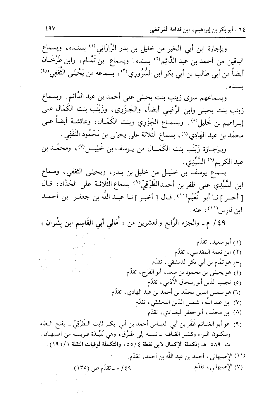 وبإجازة ابن أبي الخير من خليل بن بدر الراراني بسنده وبسماع الباقيين من أحمد بن عبد الدائم بسنده وبسماع ابن تمام وابن طرخان أيضاً من أبي طالب بن أبي بكر ابن السروري بسماعه من يحيى الثقفي بسنده.