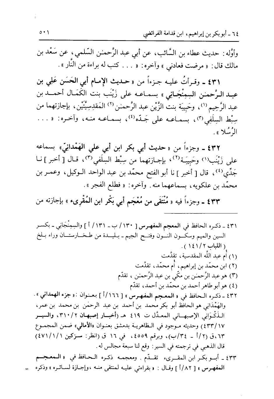 431 - وقرأت عليه جزءاً من "حديث الإمام أبي الحسن علي بن عبد الرحمن السمنجاني" بسماعه على زينب بنت الكمال أحمد بن عبد الرحيم وخبيبة بنت الزين عبد الرحمن المقدسيتين بإجازتهما من سبط السلفي بسماعه على جده بسماعه منه وآخره: "الرُسُلا"