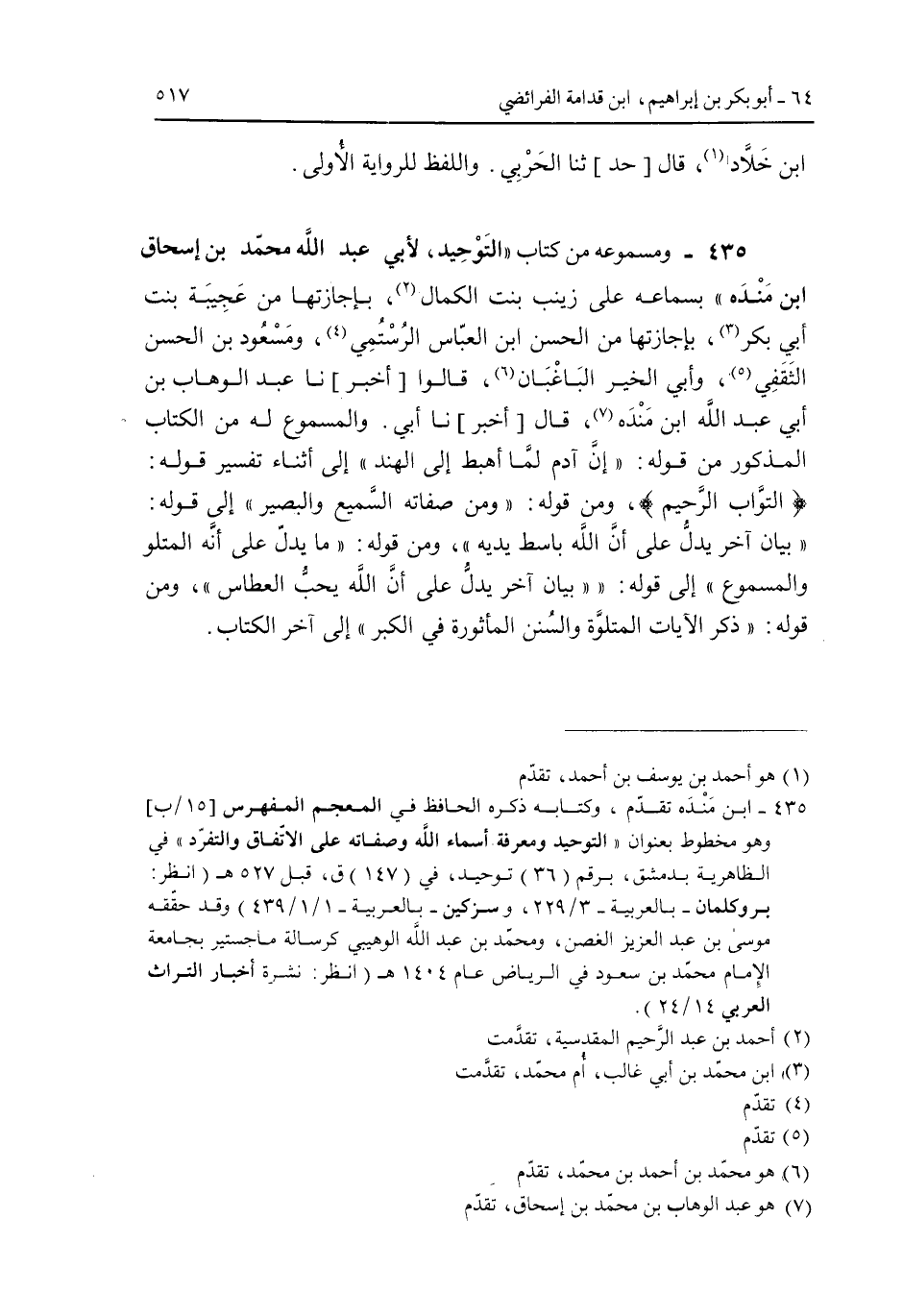 453 - ومسموعه من كتاب "التوحيد لأبي عبد الله محمد بن إسحاق ابن منده" بسماعه على زينب بنت الكمال بإجازتها من عجيبة بنت أبي بكر بإجازتها من الحسن ابن العباس الرُستُمي ومسعود بن الحسن الثقفي وأبي الخير الباغبان قالوا [أخبر] نا عبد الوهاب بن أبي عبد الله ابن منده قال [أخبر] نا أبي والمسموع له من الكتاب المذكور من قوله: "إن ىدم لما هبط إلى الهند" إلى أثناء تفسير قوله: {التواب الرحيم} ومن قوله: "ومن صفاته السميع والبصير" إلى قوله: "بيان آهر يدل على ان الله باسط يديه" ومن قوله: "ما يدل على انه المتلو والمسموع" إلى قوله: " بيان آخر يدل على ان الله ييحب العطاس" ومن قوله: "ذكر الآيات المتلوة والسنن المأثورة في الكبر" إلى آخر الكتاب.