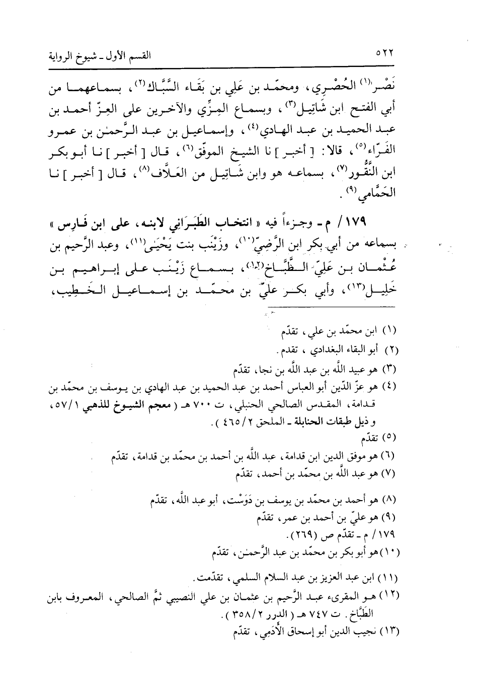 179/م- وجزءاً فيه "انتخاب الطبراني لابنه على ابن فارس" بسماعه من أبي بكر ابن الرضي وزينب بنت يحيى وعبد الرحيم بن عثمان بن علي الطباخ بسماع زينب على إبراهيم بن خليل وأبي بكر علي بن محمد بن إسماعيل الخطيب