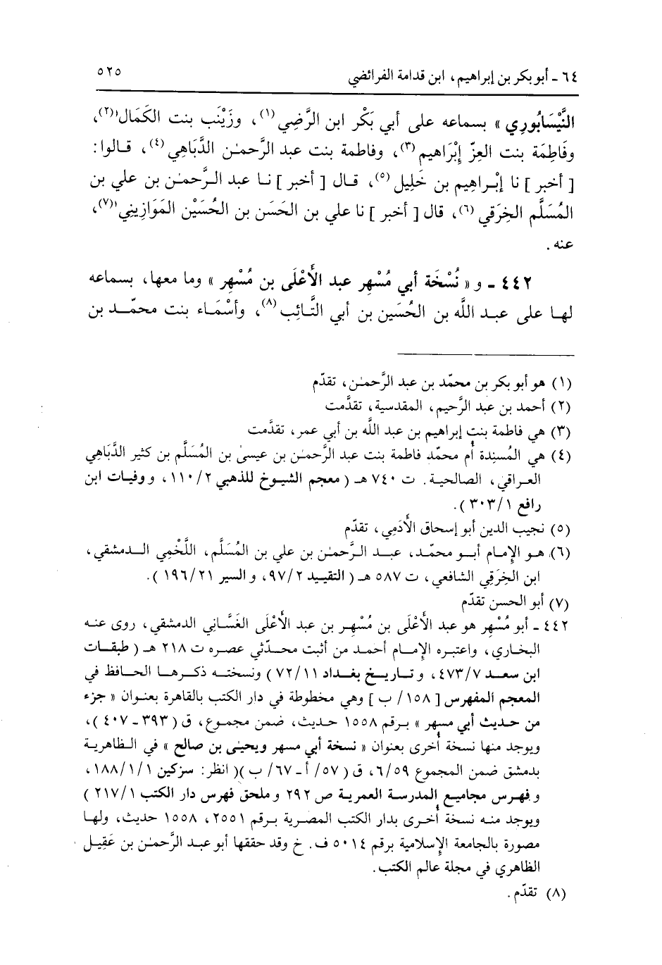 442 - و"نسخة أبي عبد الأعلى بن مسهر" وما معها وبسماعه لها على عبد الله بن الحسين بن أبي التائب وأسماء بنت محمد بن