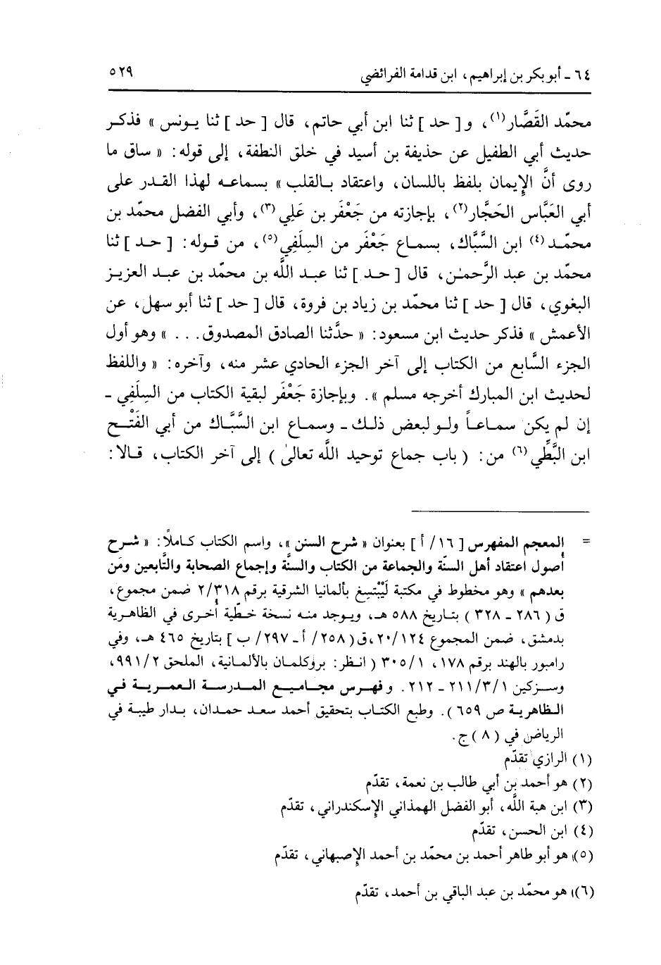محمد القصار و [حد] ثنا ابن أبي حاتم قال [حد] ثنا يونس فذكر حديث أبي الطفيل عن حذيفة بن أسيد في خلق النطفة إلى قوله: "ساق ما روى أن الإيمان بلفظ اللسان واعتقاد القلب" بسماعه لهذا القدر على أبي العباس الحجار بإجازته من جعفر بن علي وأبي الفضل محمد ابن السباك بسماع جعفر من السلفي من قوله حدثنا محمد بن عبد الرحمن قال [حد] ثنا عبد الله بن محمد بن عبد العزيز البغوي قال [حد] ثنا محمد بن زيادة بن فروة قال [حد] ثنا أبو سهل عن الأعمش" فذكر حديث ابن مسعود: "حدثنا الصادق المصدوق ... " وهو أول الجزء السابع من الكتاب إلى آخر الجزء الحادي عشر منه وآخره: "واللفظ لحديث ابن المبارك أخرجه مسلم".