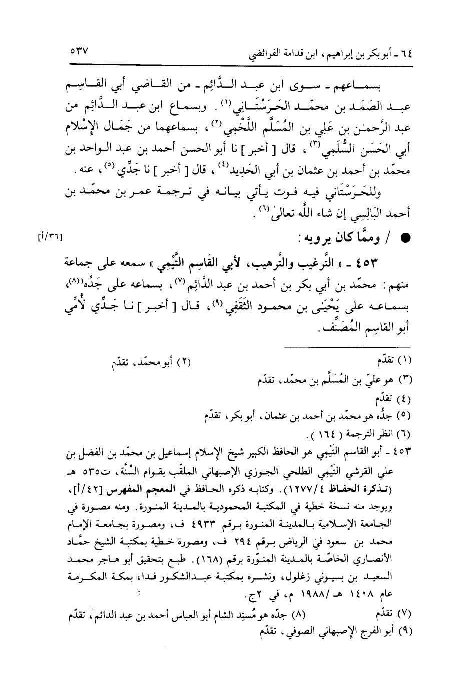 453 - "الترغيب والترهيب لأبي القاسم التيمي" سمعه على جماعة منهم: محمد بن أبي بكر بن احمد بن عبد الدائم بسماعه على جده بسماعه على يحيى بن محمود الثقفي قال [أخبر] نا جدي لأمي أبو القاسم المصنف