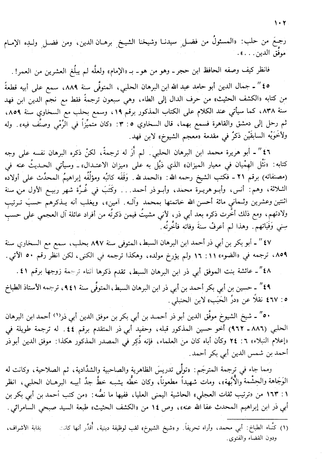 45 " - جمال الدين أبو حامد عبد الله ابن البرهان الحلبي، المتوفى سنة 889، سمع على أبيه قطعة من كتابه " الكشف " الحثيث " من حرف الدال إلى الطاء، وهي سبعون ترجمة فقط مع نجم الدين ابن فهد سنة 838، كما سيأتي عند الكلام على الكتاب المذكور برقم 19، وسمع بحلب مع السخاوي سنة 859، ثم رحل إلى دمشق والقاهرة فسمع بهما، قال السخاوي 5: 3 " كان متميزا في الرمي وصنف فيه ".
