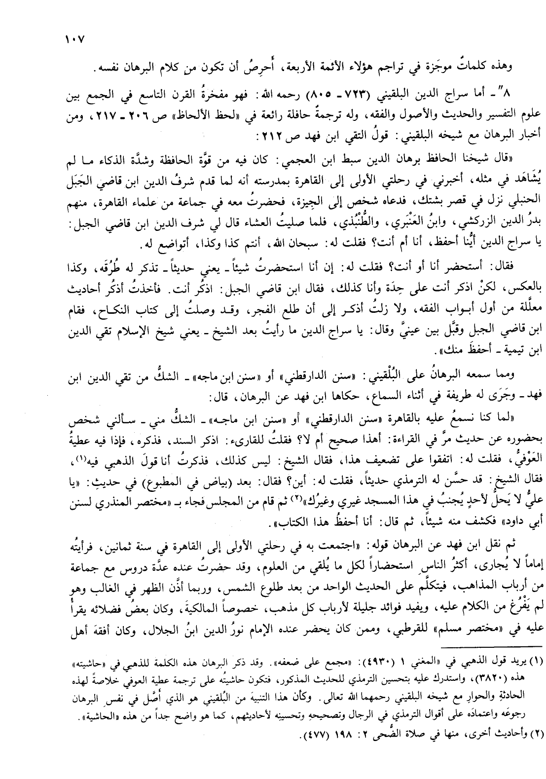 723 - 805- رحمه الله: فهو مفخرة القرن التاسع في الجمع بين علوم التفسير والحديث والاصول والفقه، وله ترجمة حافلة رائعة في " لحظ الالحاظ " ص 206 - 217، ومن أخبار البرهان مع شيخه البلقيني: قول التقي ابن فهذ ص 212: " قال شيخنا الحافظ برهان الدين سبط ابن العجمي: كان فيه من قوة الحافظة وشدة الذكاء ما لم يشاهد في مثله، أخبرني في رحلتي الاولى إلى القاهرة بمدرسته أنه لما قدم شرف الدين ابن قاضي الجبل الحنبلي نزل في قصر بشتك، فدعاه شخص إلى الجيزة، فحضرت معه في جماعة من علماء القاهرة، منهم بدر الدين الزركشي، وابن العنبري، والطنبذي، فلما صليت العشاء قال لي شرف الدين ابن قاضي الجبل: يا سراج الدين أينا أحفظ، أنا أم أنت؟ فقلت له: سبحان الله، أنتم كذا وكذا، أتواضع له.