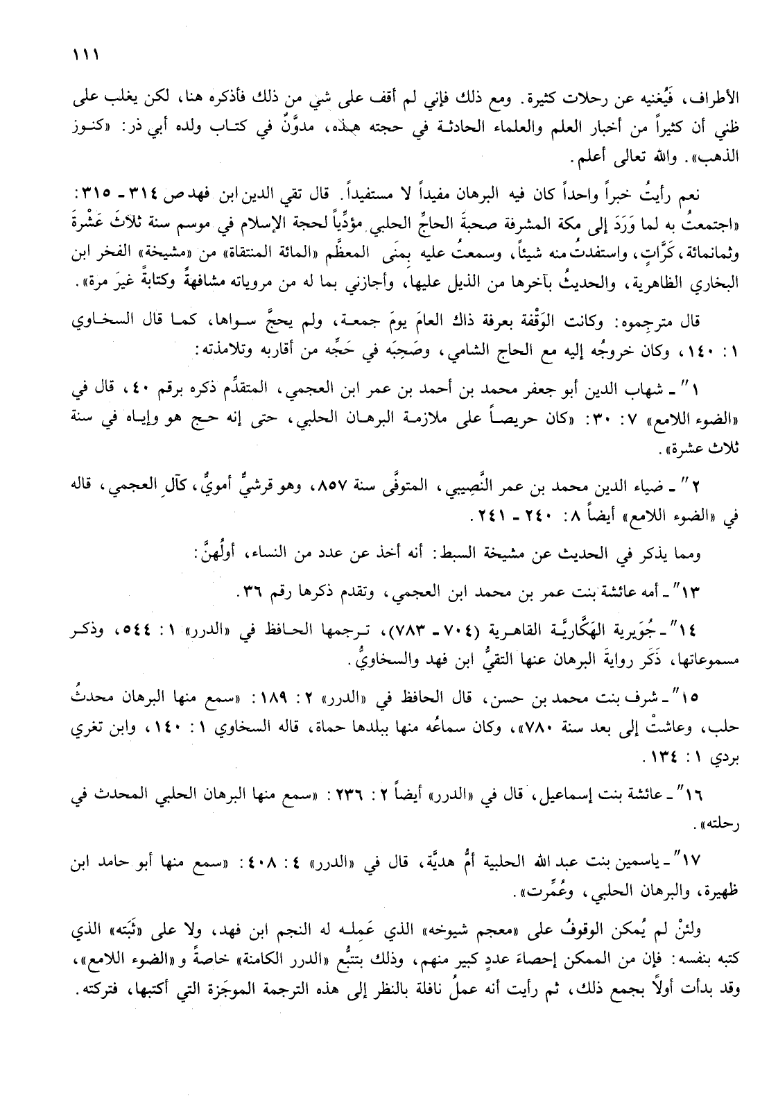 17 " - ياسمين بنت عبد الله الحلبية أم هدية، قال في " الدرر " 4: 408: " سمع منها أبو حامد ابن ظهيرة، والبرهان الحلبي، وعمرت ".