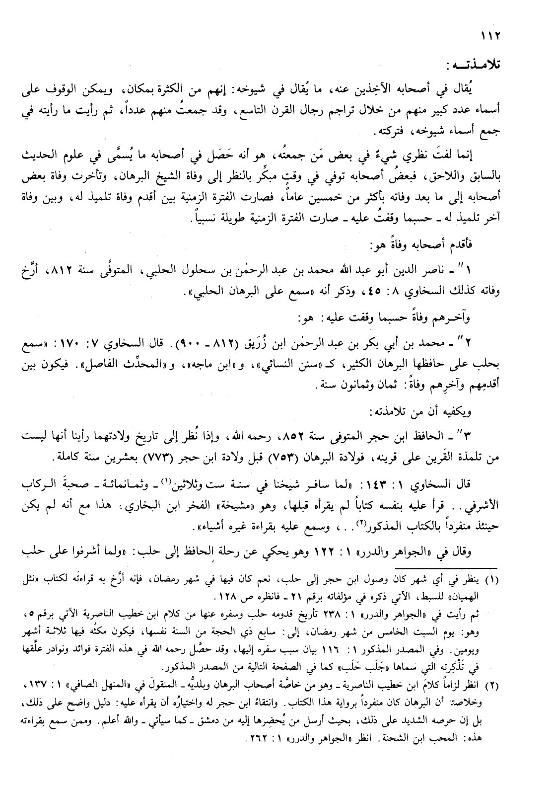 ويكفيه أن من تلامذته: 3 " - الحافظ ابن حجر المتوفى سنة 852، رحمه الله، وإذا نظر إلى تاريخ ولادتهما رأينا أنها ليست من تلمذة القرين على قرينه، فولادة البرهان