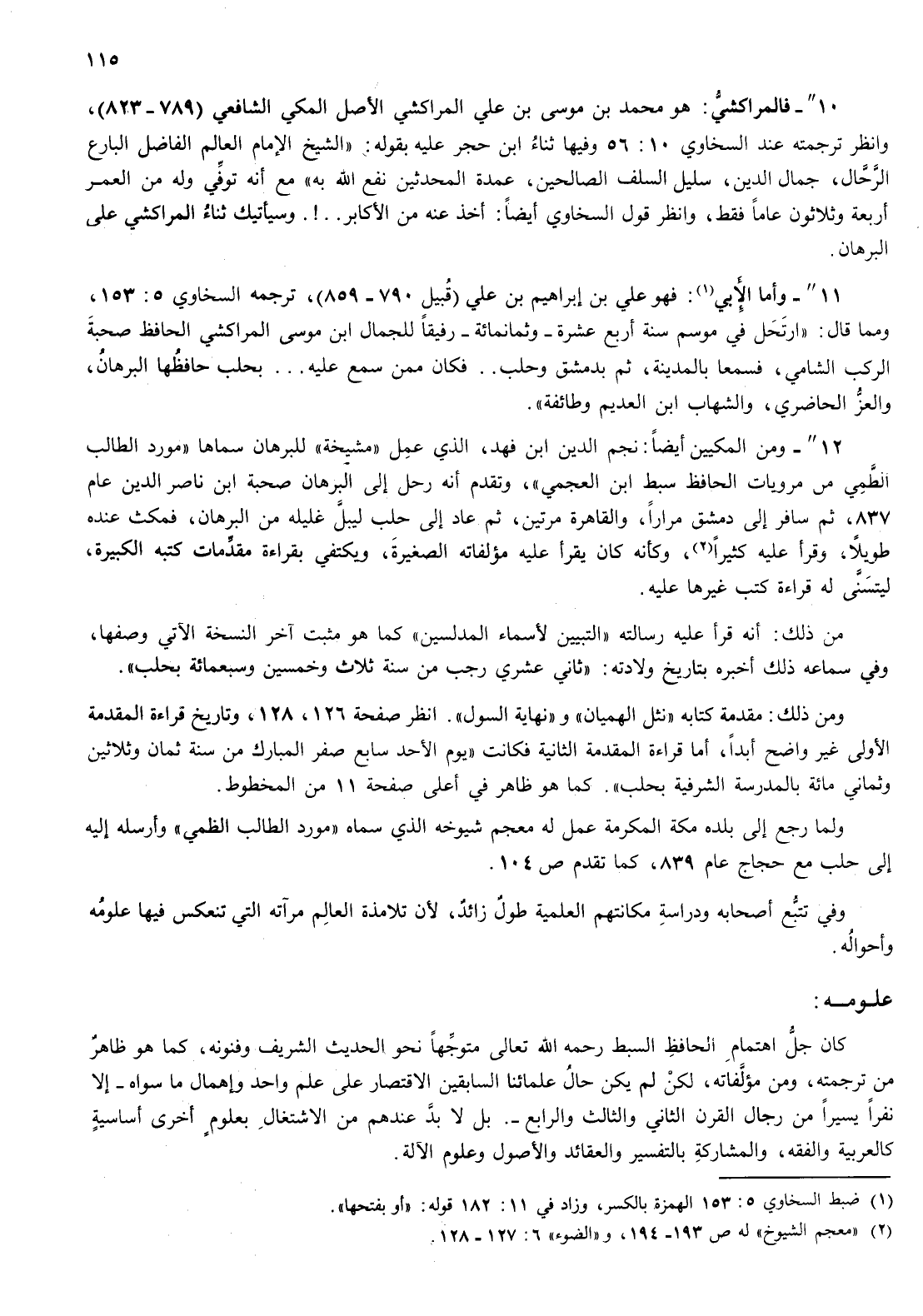 12 " - ومن المكيين أيضا: نجم الدين ابن فهد، الذي عمل " مشيخة " للبرهان سماها " مورد الطالب الطمي من مرويات الحافظ سبي ابن العجمي "، وتقدم أنه رحل إلى البرهان صحبة ابن ناصر الدين عام 837، ثم سافر إلى دمشق مرارا، والقاهرة مرتين، ثم عاد إلى حلب ليبل غليله من البرهان، فمكث عنده طويلا، وقرأ عليه كثيرا