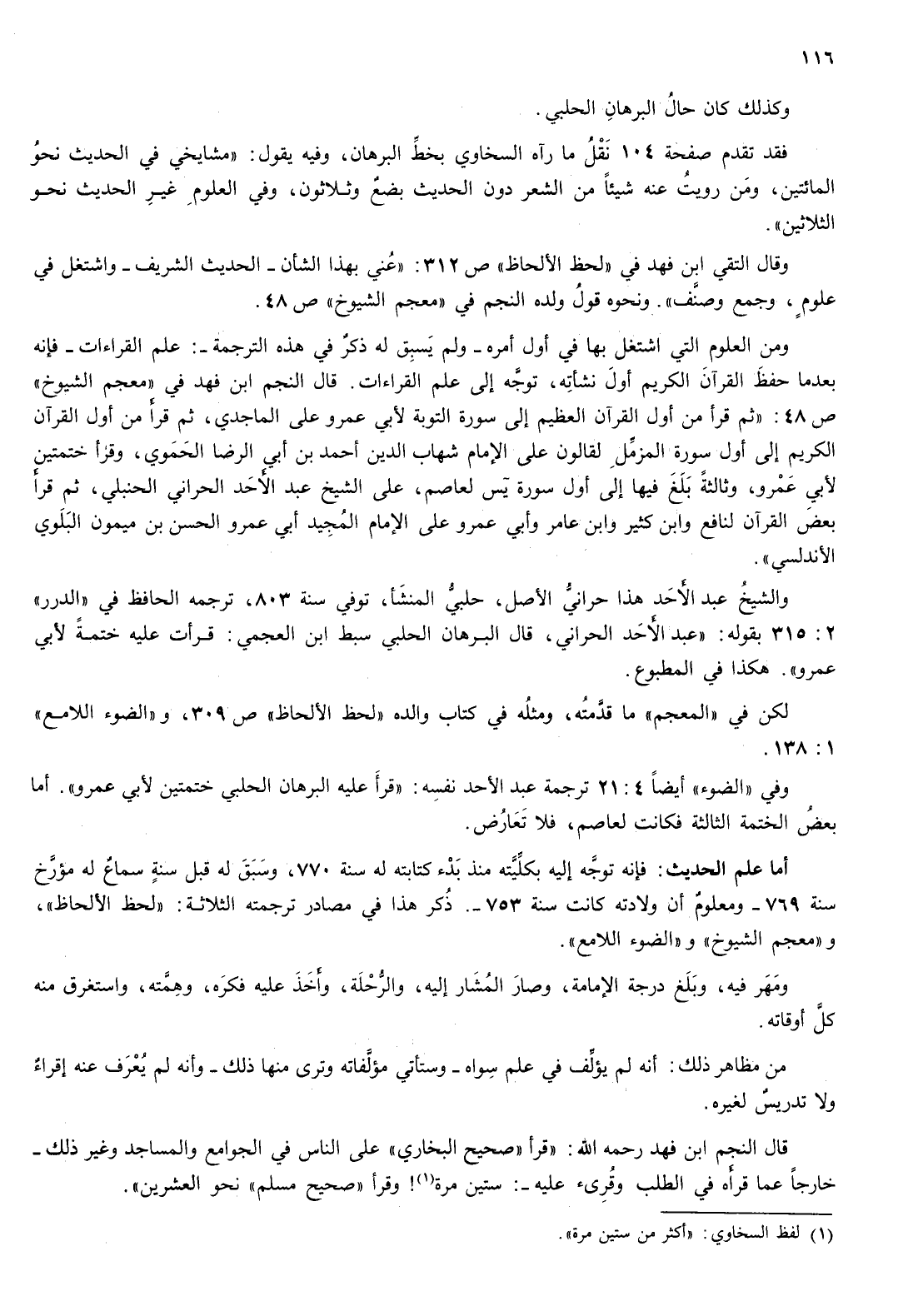 والشيخ عبد الاحد هذا حراني الاصل، حلبي المنشا، توفي سنة 803، ترجمه الحافظ في " الدرر " 2: 315 بقوله: " عبد الاحد الحراني، قال البرهان الحلبي سبط ابن العجمي: قرأت عليه ختمة لابي عمرو ".