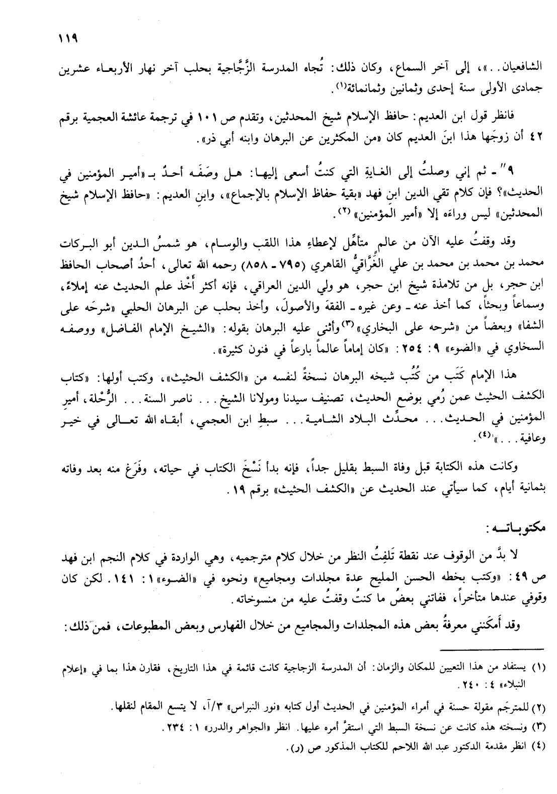 9 " - ثم إني وصلت إلى الغاية التي كنت أسعى إليها: هل وصفه أحد ب " أمير المؤمنين في الحديث "؟ فان كلام تقي الدين ابن فهد " بقية حفاظ الاسلام بالاجماع "، وابن العديم: " حافظ الاسلام شيخ المحدثين " ليس وراء إلا " أمير المؤمنين "