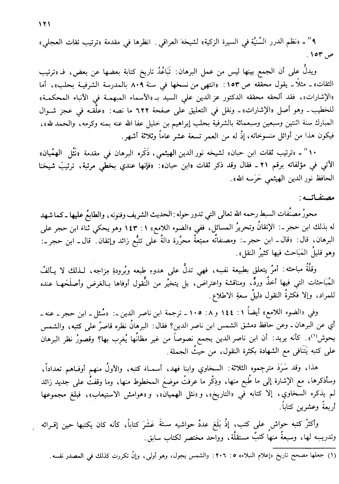 10 " - " ترتيب ثقات ابن حبان " لشيخه نور الدين الهيثمي، ذكره البرهان في مقدة " نثل الهميان " الآتي في مؤلفاته برقم 21 - فقال وقد ذكر ثقات " ابن حبان ": " فانها عندي بخطي مرتبة، ترتيب شيخنا الحافظ نور الدين الهيثمي حرسه الله ".