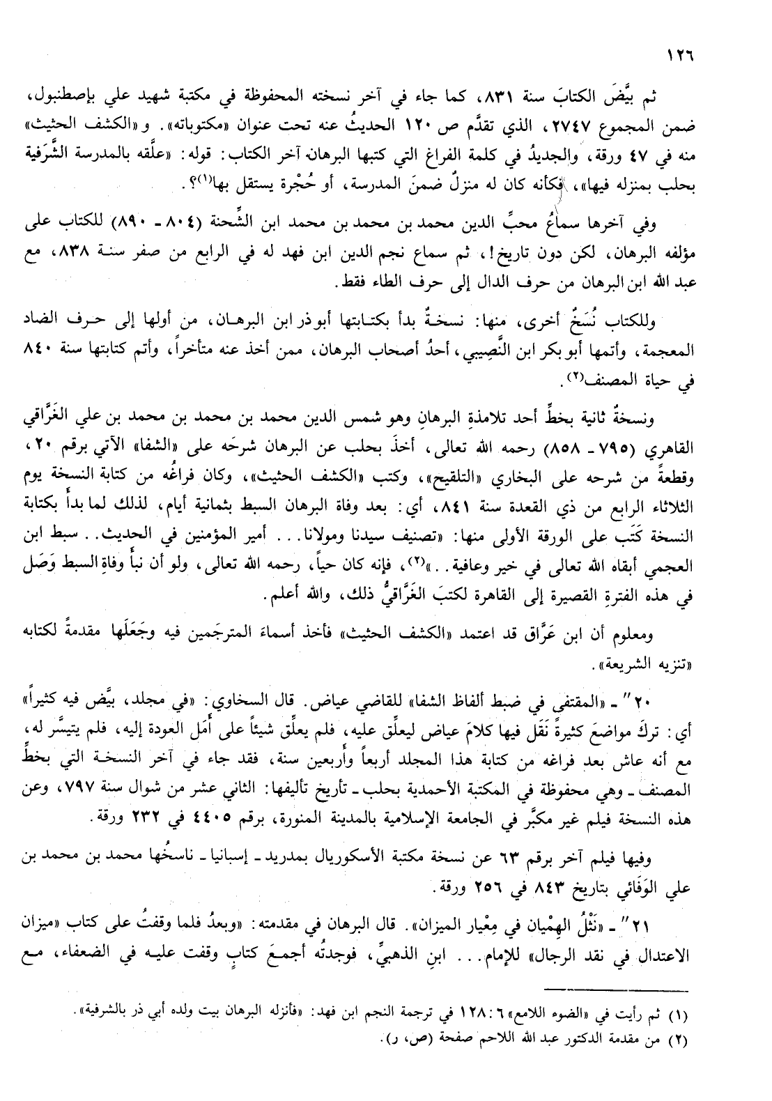 و" الكشف الحثيث " منه في 47 ورقة، والجديد في كلمة الفراغ التي كتبها البرهان آخر الكتاب: قوله: " علقه بالمدرسة الشرفية بحلب بمنزله فيها "، فكأنه كان له منزل ضمن المدرسة، أو حجرة يستقل بها