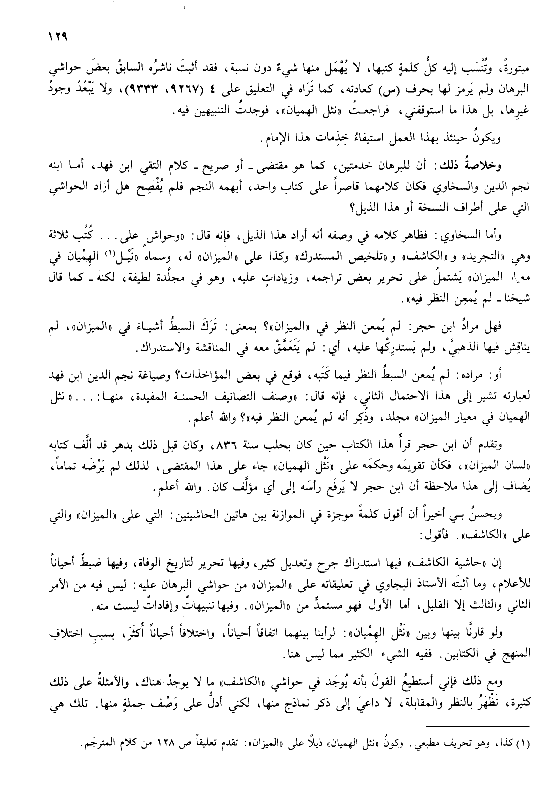 فاقول: إن " حاشية الكاشف " فيها استدراك جرح وتعديل كثير، وفيها تحرير لتاريخ الوفاة، وفيها ضبط أحيانا للاعلام، وما أثبته الاستاذ البجاوي في تعليقاته على " الميزان " من حواشي البرهان عليه: ليس فيه من الامر الثاني والثالث إلا القليل، أما الاول فهو مستمد من " الميزان ".