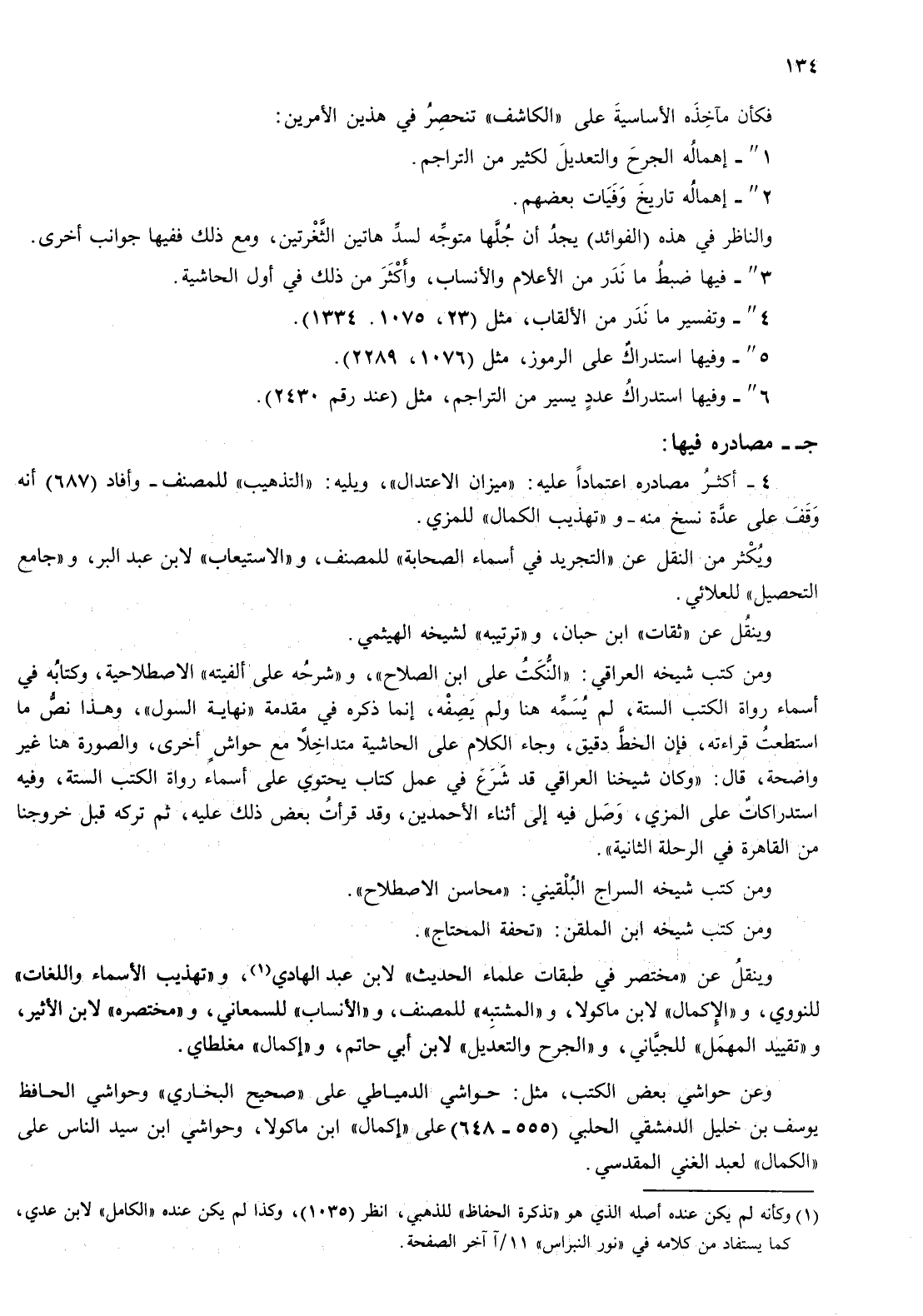 فكان مآخذه الاساسية على " الكاشف " تنحصر في هذين الامرين: 1 " - إهماله الجرح والتعديل لكثير من التراجم.