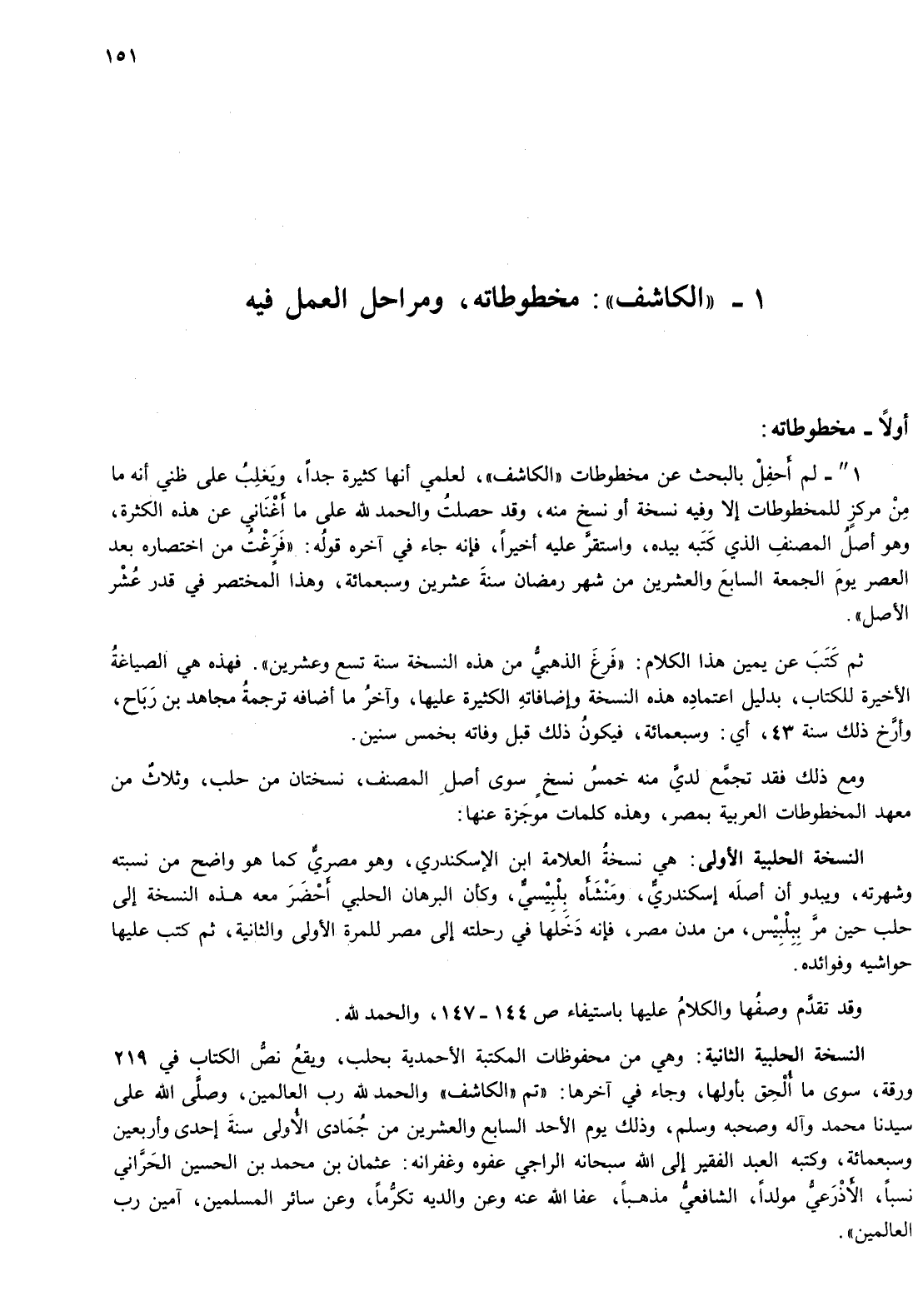 1 " - لم أحفل بالبحث عن مخطوطات " الكاشف "، لعلمي أنها كثيرة جدا، ويغلب على ظني إنه ما من مركز للمخطوطات إلا وفيه نسخة أو نسخ منه، وقد حصلت والحمد لله على ما اغناني عن هذه الكثرة،