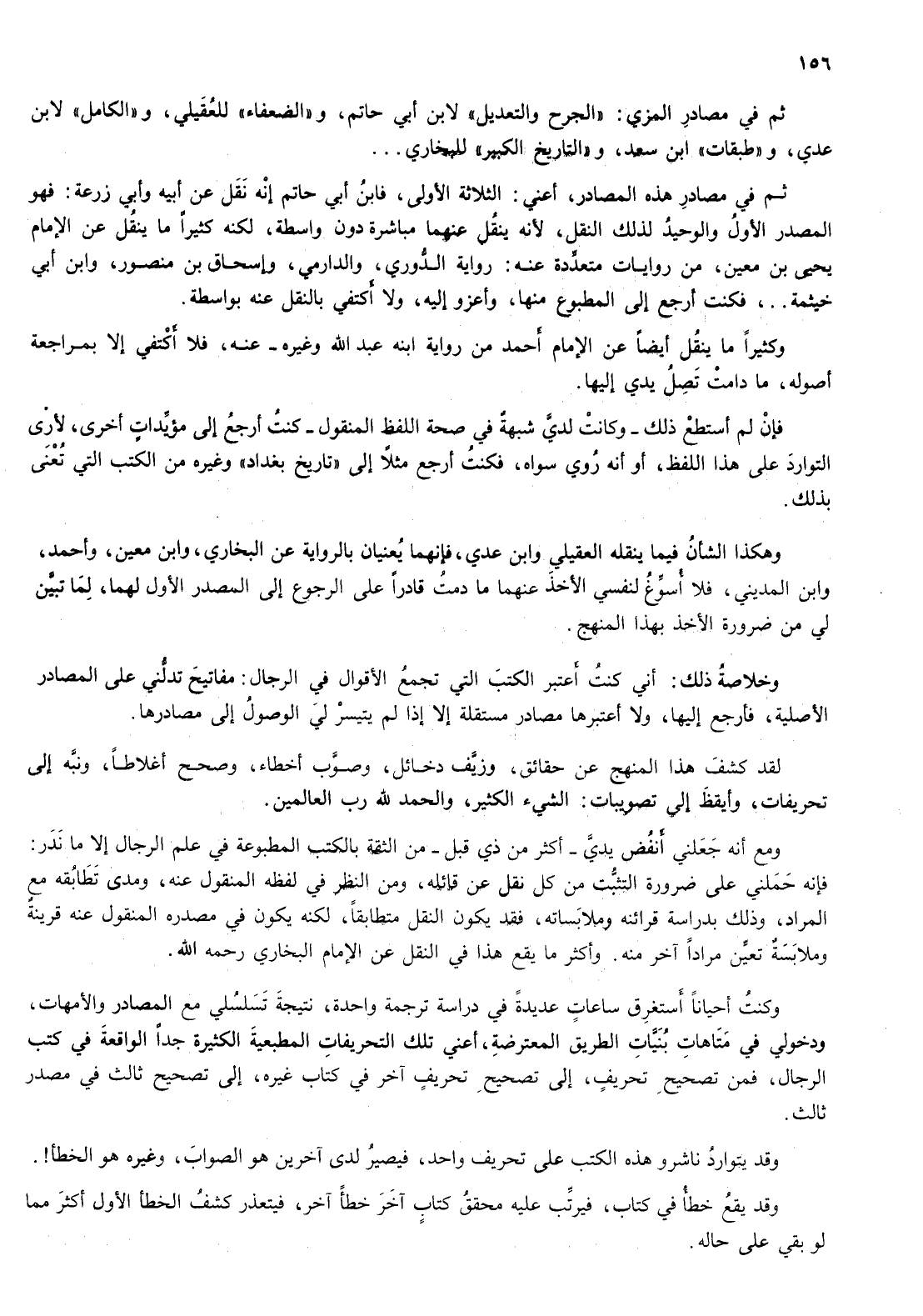 وهكذا الشان فيما ينقله العقيل وابن عدي، فانهما يعنيان بالرواية عن البخاري، وابن معين، وأحمد، وابن المديني، فلا أسوغ لنفسي الاخذ عنهما ما دمت قادرا على الرجوع إلى المصدر الاول لهما، لما تبين لي من ضرورة الاخذ بهذا المنهج.