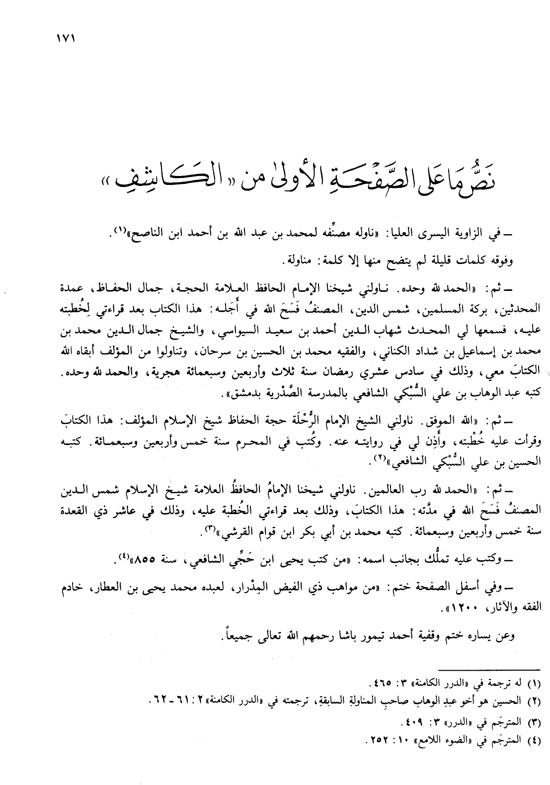 نص ما على الصفحة الاولى من " الكاشف " - في الزاوية اليسرى العليا: " ناوله مصنفه لمحمد بن عبد الله بن أحمد ابن الناصح "