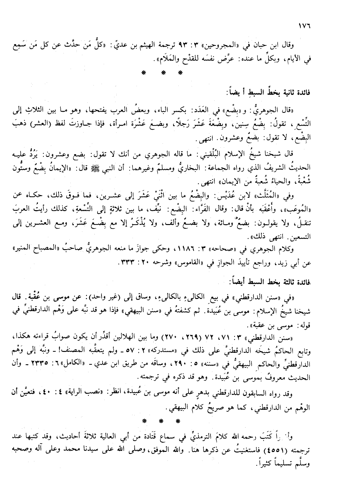 قال شيخنا شيخ الاسلام البلقيني: ما قاله الجوهري من أنك لا تقول: بضع وعشرون: يرد عليه الحديث الشريف الذي رواه الجماعة: البخاري ومسلم وغيرهما: أن النبي صلى الله عليه وسلم قال: " الايمان بضع وستون شعة، والحياء شعبة من الايمان " انتهى.