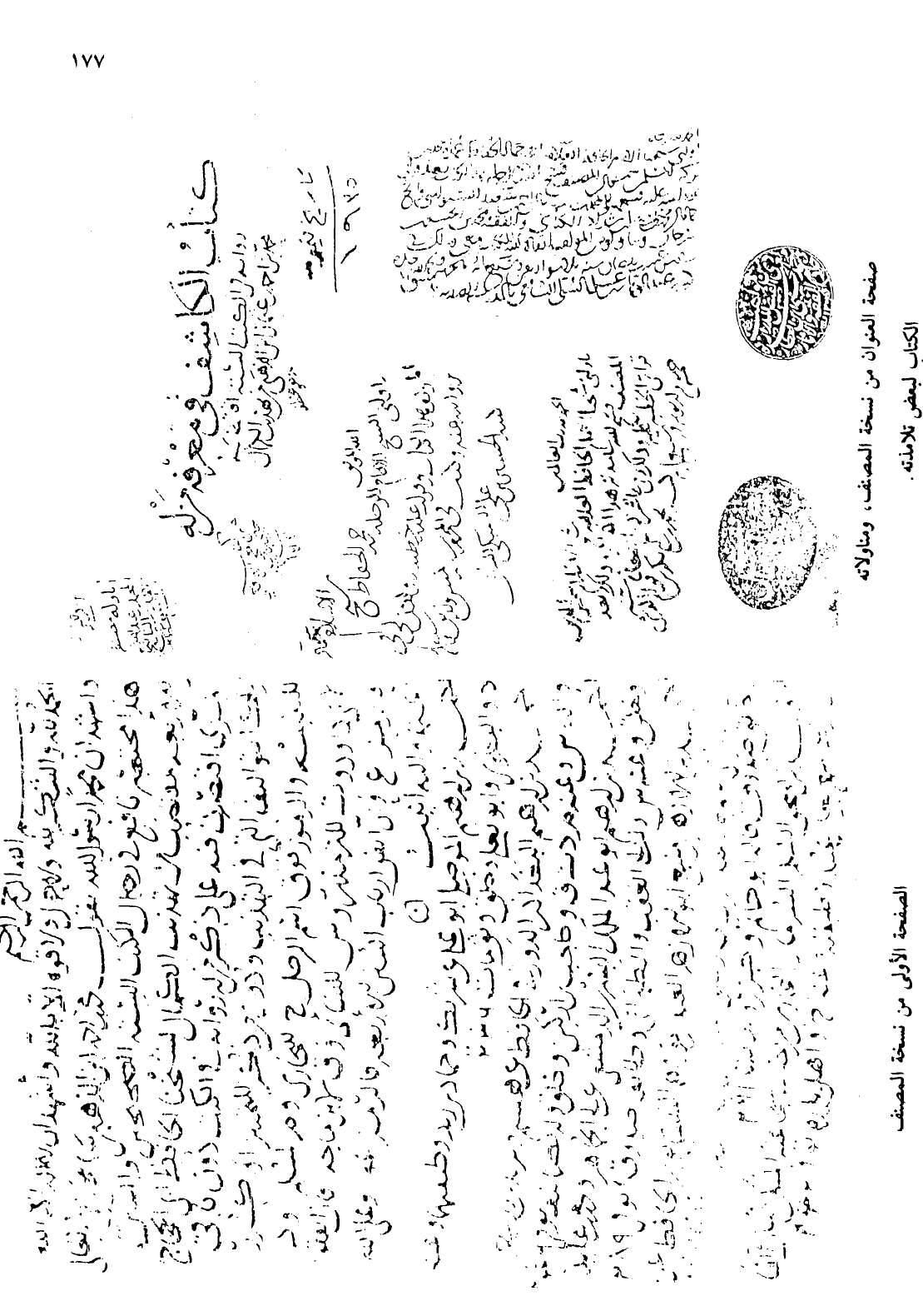 صفحة العنوان من نسخة المصنف ومناولاته الكتاب لبعض تلامذته الصفحة الاولى من نسخة المصنف