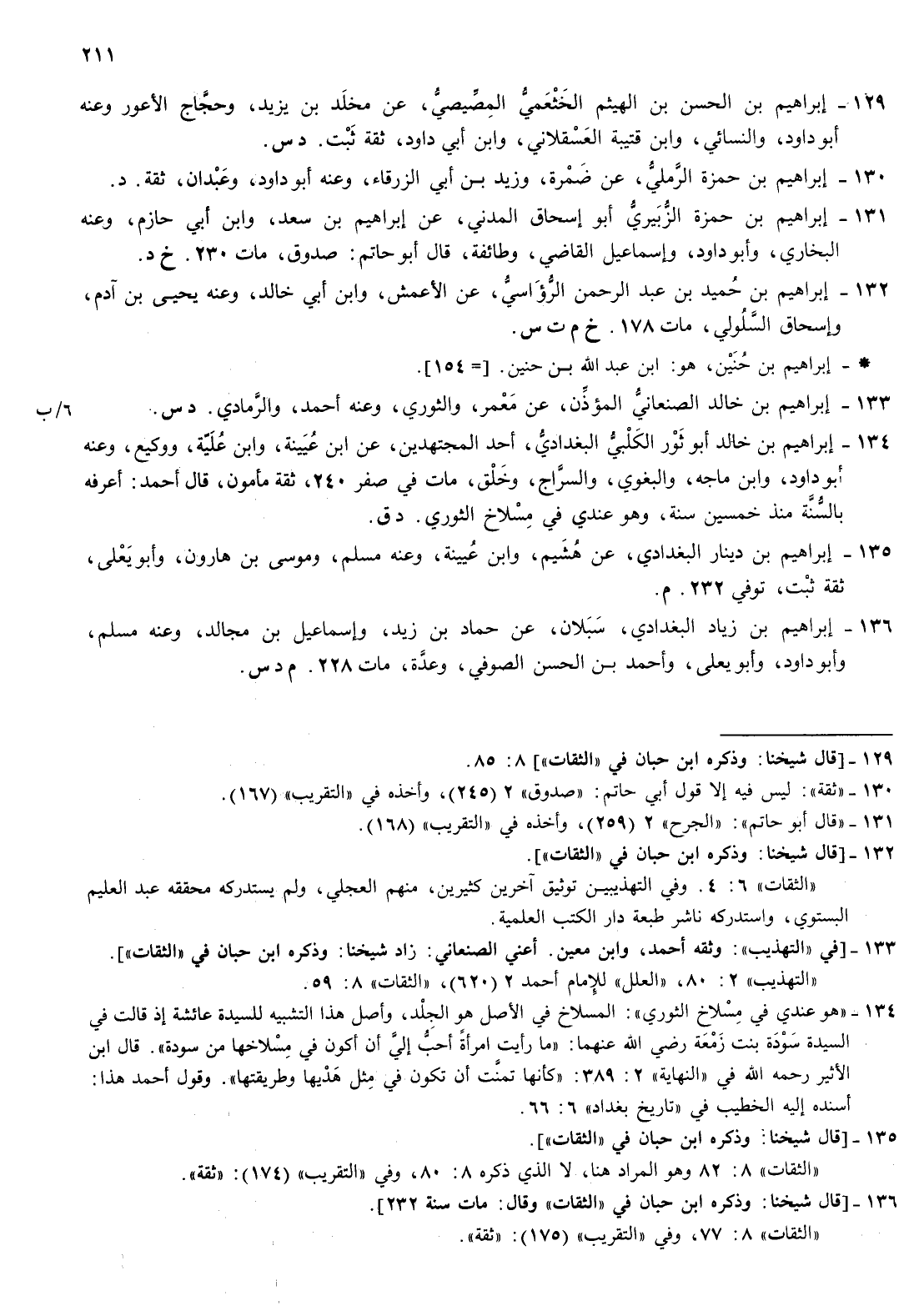 134- إبراهيم بن خالد أبو ثور الكلبي البغدادي أحد المجتهدين عن بن عيينة وابن علية ووكيع وعنه أبو داود وابن ماجة والبغوي والسراج وخلق مات في صفر 24 ثقة مأمون قال أحمد أعرفه بالسنة منذ خمسين سنة وهو عندي في مسلاخ الثوري د ق