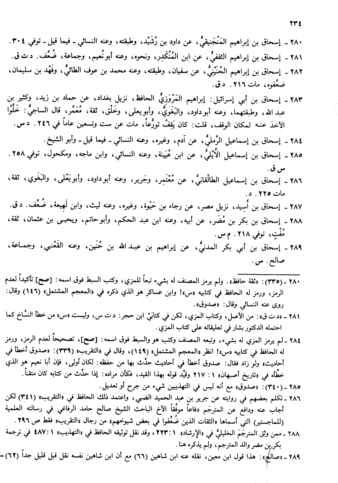 283- إسحاق بن أبي إسرائيل إبراهيم المروزي الحافظ نزيل بغداد عن حماد بن زيد وكثير بن عبد الله وطبقتهما وعنه أبو داود والبغوي وأبو يعلى وخلق ثقة معمر قال الساجي خلوا الاخذ عنه لمكان الوقف قلت كان يقف تورعا مات عن ست وتسعين عاما في 246 د س