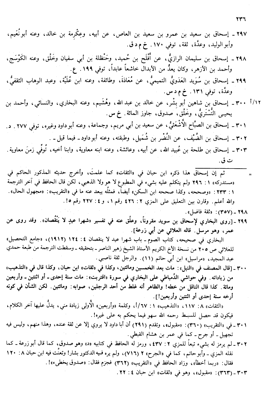 299- إسحاق بنسويد العدوي التميمي عن معاذة وطائفة وعنه بن علية وعبد الوهاب الثقفي وعدة توفي 131 خ م د س