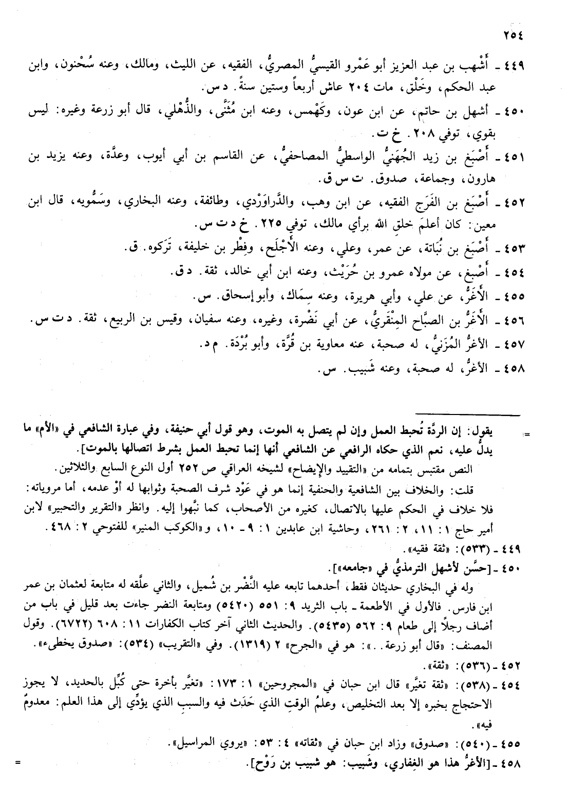 449- أشهب بن عبد العزيز أبو عمرو القيسي المصري الفقيه عن الليث ومالك وعنه سحنون وابن عبد الحكم وخلق مات 204 عاش أربعا وستين سنة د س