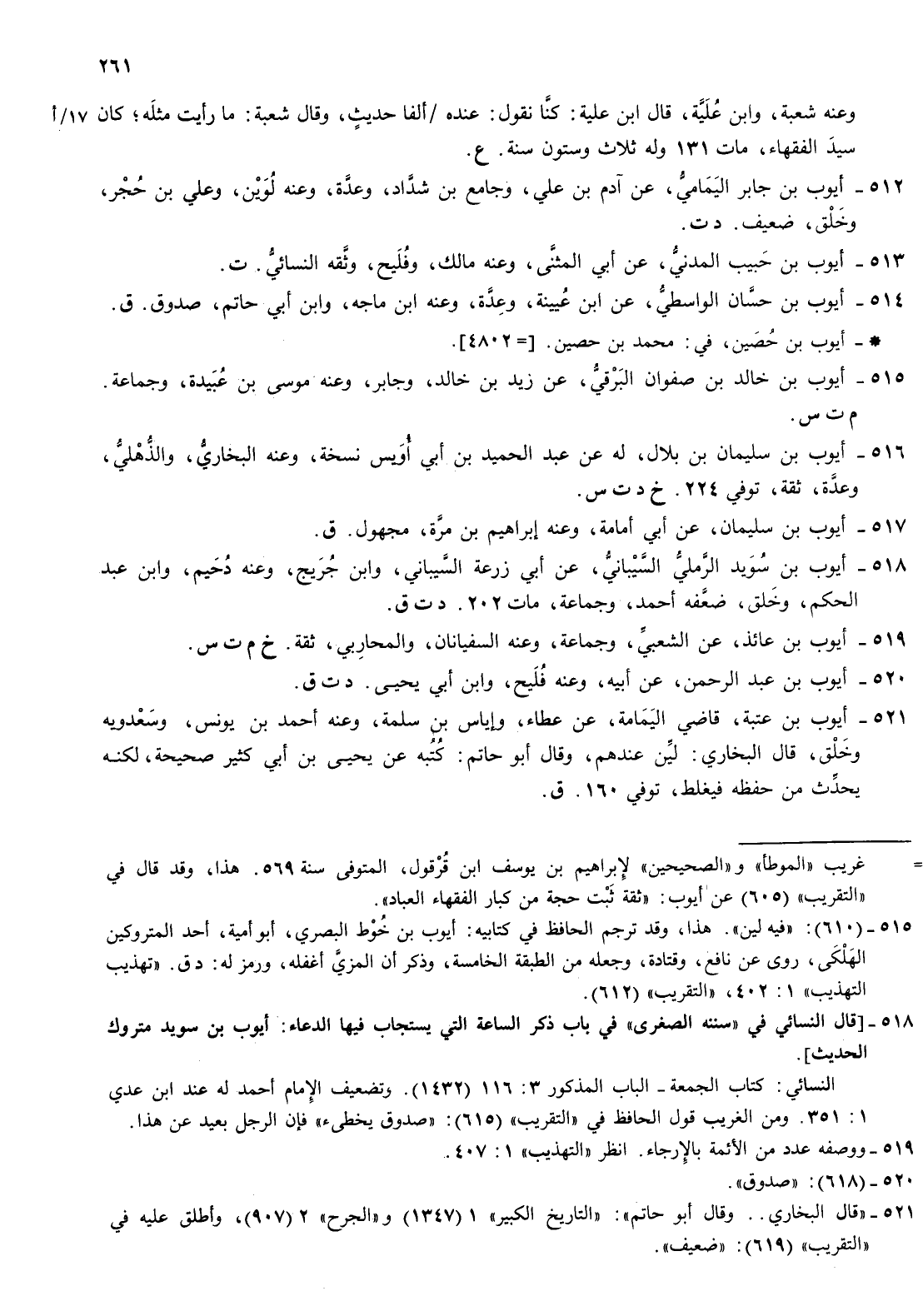 518- أيوب بن سويد الرملي السيباني عن أبي زرعة السيباني وابن جريج وعنه دحيم وابن عبد الحكم وخلق ضعفه أحمد وجماعة مات 202 د ت ق