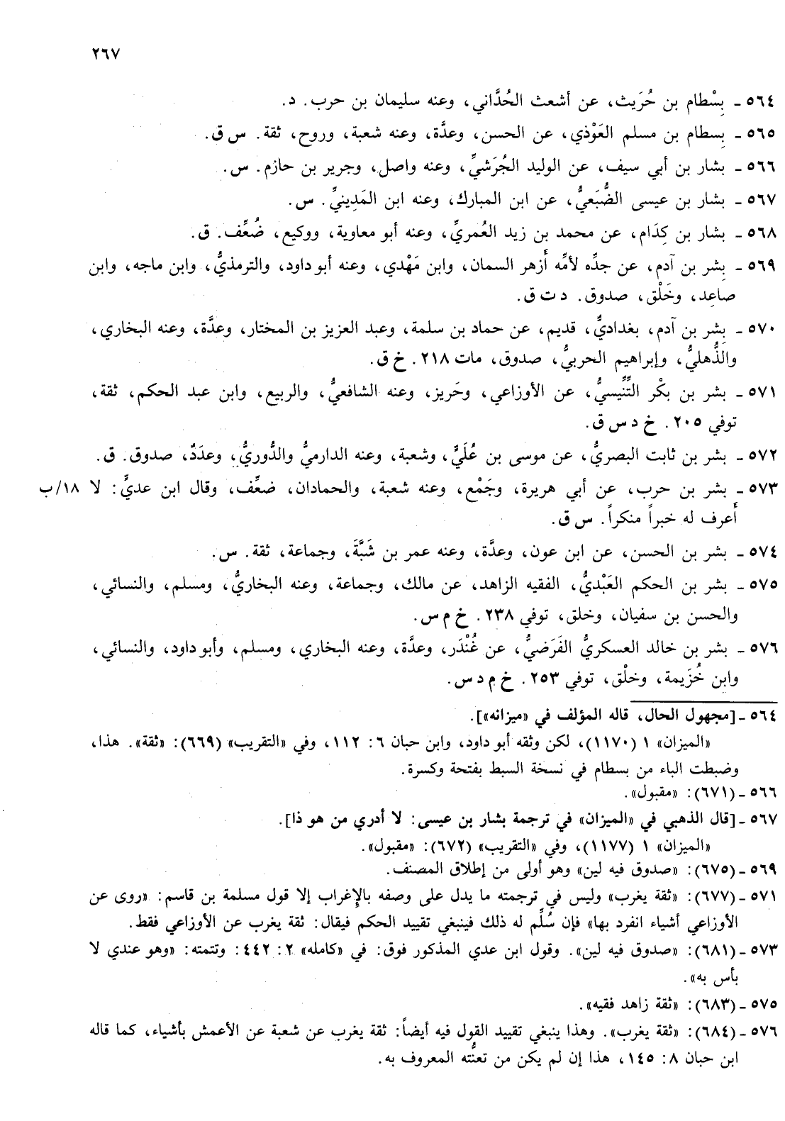570- بشر بن آدم بغدادي قديم عن حماد بن سلمة وعبد العزيز بن المختار وعدة وعنه البخاري والذهلي وإبراهيم الحربي صدوق مات 218 خ ق