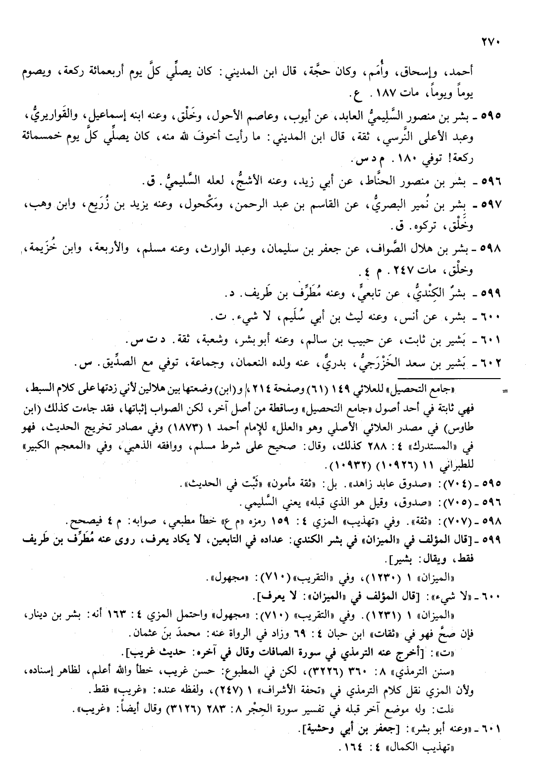 595- بشر بن منصور السليمي العابد عن أيوب وعاصم الاحول وخلق وعنه ابنه إسماعيل والقواريري وعبد الاعلى النرسي ثقة قال بن المديني ما رأيت أخوف لله منه كان يصلي كل يوم خمسمائة ركعة توفي 18 م د س