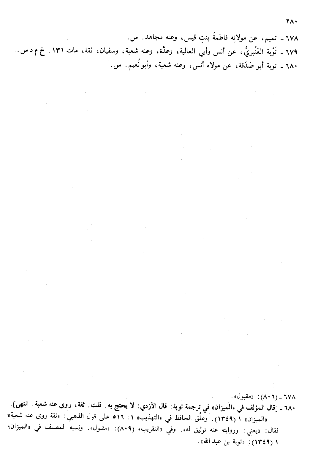 679- توبة العنبري عن أنس وأبي العالية وعدة وعنه شعبة وسفيان ثقة مات 131 خ م د س