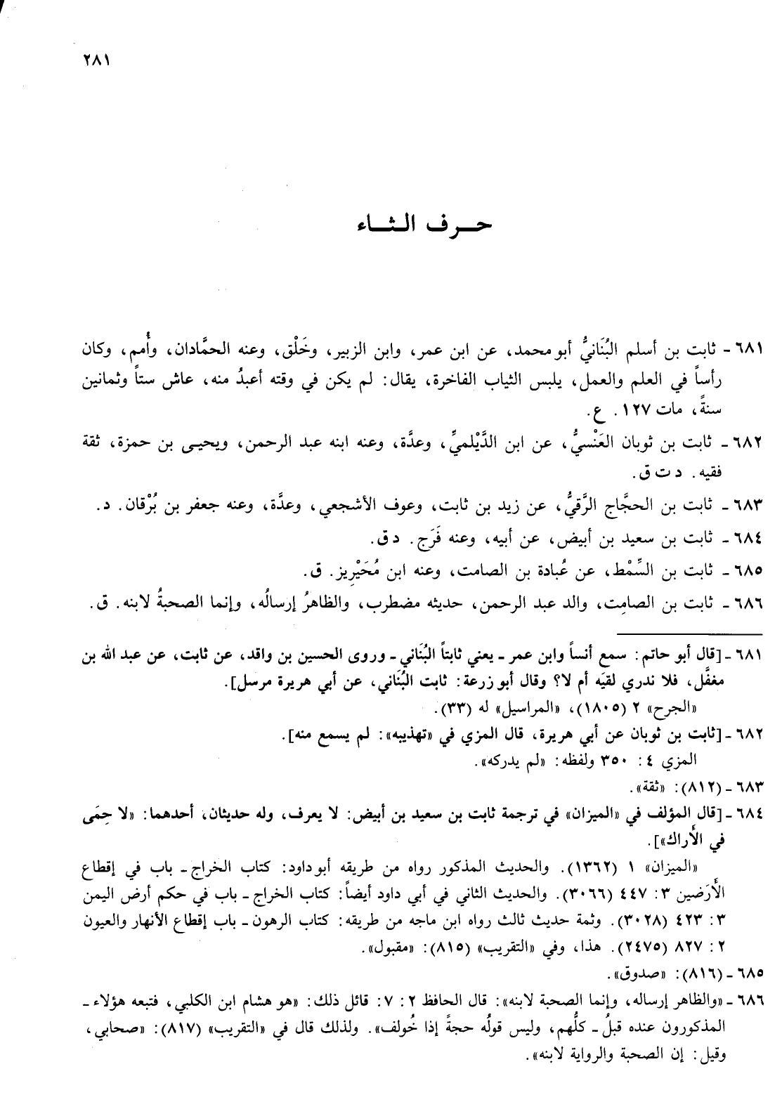 681- ثابت بن أسلم البناني أبو محمد عن بن عمر وابن الزبير وخلق وعنه الحمادان وأمم وكان رأسا في العلم والعمل يلبس الثياب الفاخرة يقال لم يكن في وقته أعبد منه عاش ستا وثمانين سنة مات 127 ع