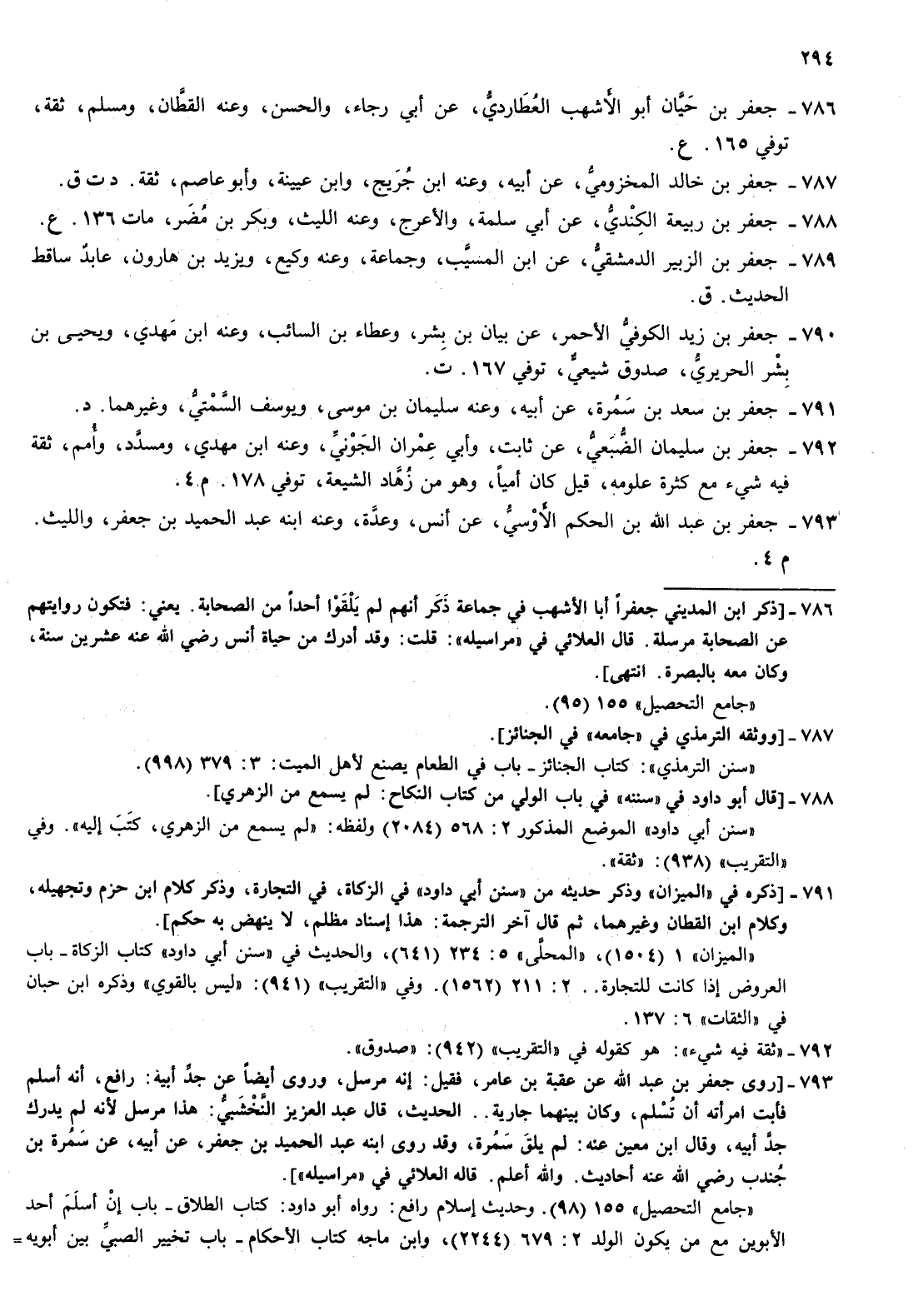 792- جعفر بن سليمان الضبعي عن ثابت وأبي عمران الجوني وعنه بن مهدي ومسدد وأمم ثقة فيه شئ مع كثرة علومه قيل كان أميا وهو من زهاد الشيعة توفي 178 م 4