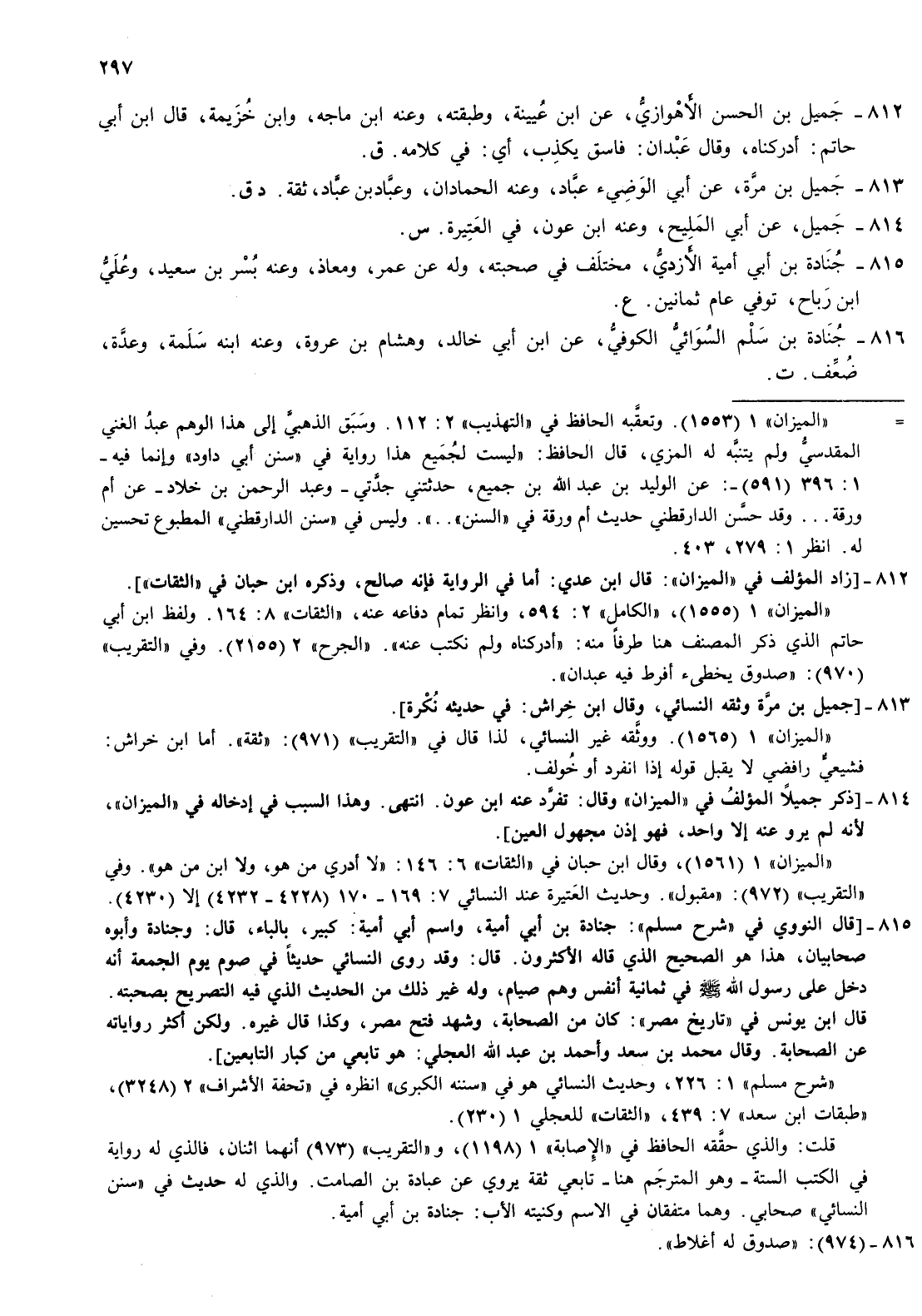 815- جنادة بن أبي أمية الازدي مختلف في صحبته وله عن عمر ومعاذ وعنه بسر بن سعيد وعلي بن رباح توفي عام ثمانين ع