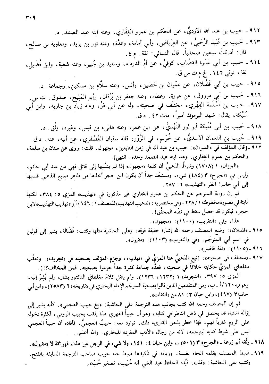 919- حبيب بن النعمان الاسدي عن خريم في الزور قاله سفيان العصفري عن أبيه عنه د ق