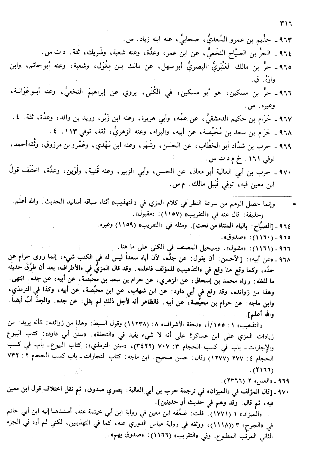 969- حرب بن شداد أبو الخطاب عن الحسن وشهر وعنه بن مهدي وعمرو بن مرزوق وثقه أحمد توفي 161 خ م د ت س