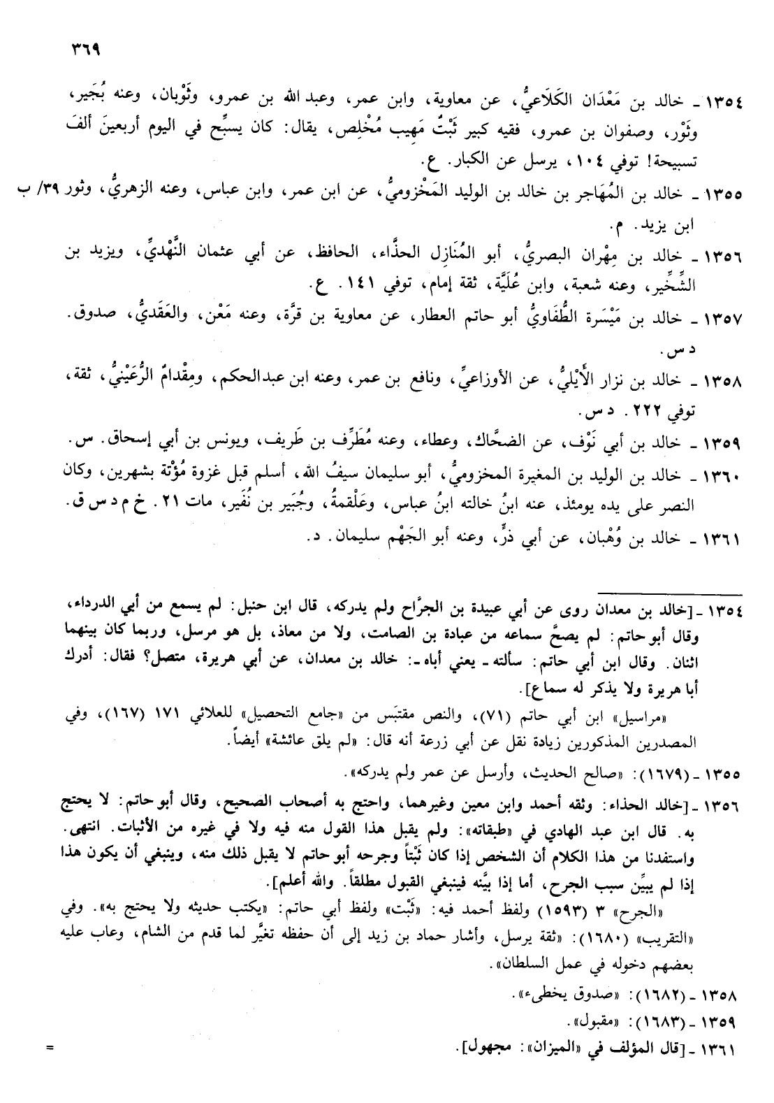 1354- خالد بن معدان الكلاعي عن معاوية وابن عمر وعبد الله بن عمرو وثوبان وعنه بجير وثور وصفوان بن عمرو فقيه كبير ثبت مهيب مخلص يقال كان يسبح في اليوم أربعين ألف تسبيحة توفي 104 يرسل عن الكبار ع