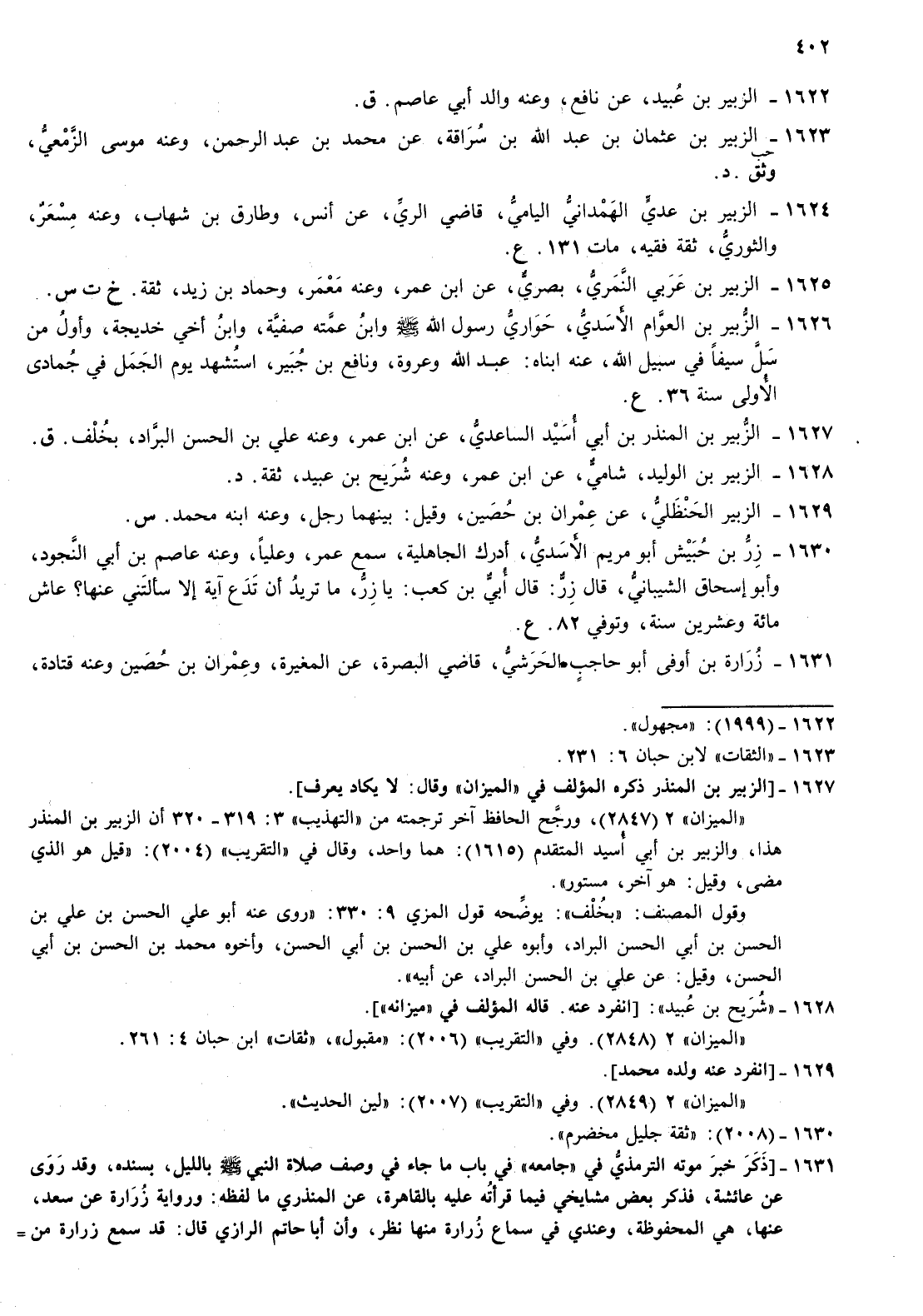 1626- الزبير بن العوام الاسدي حواري رسول الله صلى الله عليه وسلم وابن عمته صفية وابن أخي خديجة وأول من سل سيفا في سبيل الله عنه ابناه عبد الله وعروة ونافع بن جبير استشهد يوم الجمل في جمادى الاولى سنة 36 ع