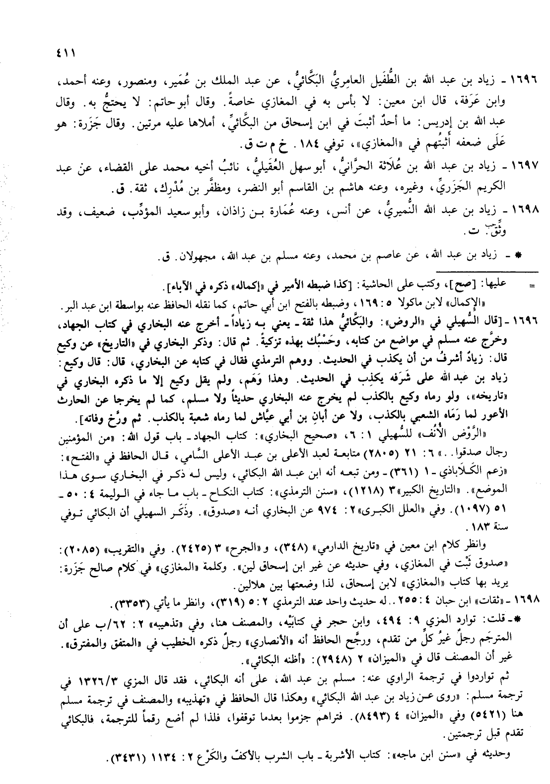 1696- زياد بن عبد الله بن الطفيل العامري البكائي عن عبد الملك بن عمير ومنصور وعنه أحمد وابن عرفة قال بن معين لا بأس به في المغازي خاصة وقال أبو حاتم لا يحتج به وقال عبد الله بن إدريس ما أحد أثبت في بن إسحاق من البكائي أملاها عليه مرتين وقال جزرة هو على ضعفه أثبتهم في المغازي توفي 184 خ م ت ق