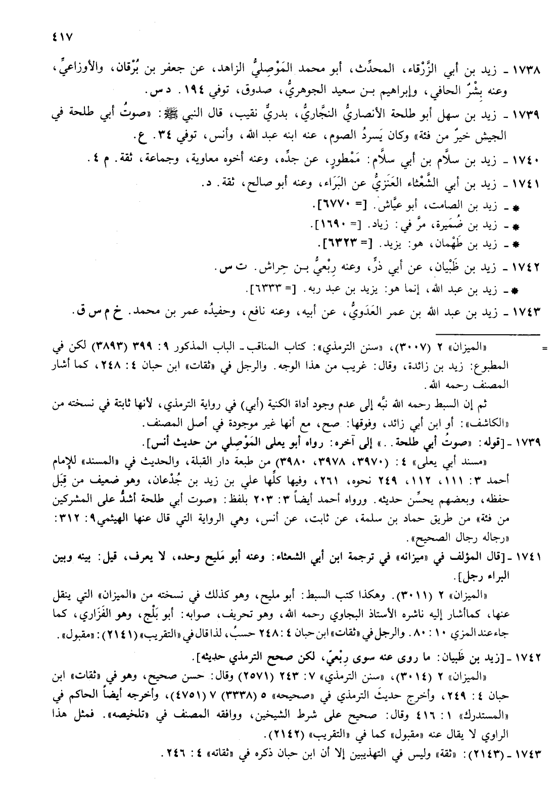 1738- زيد بن أبي الزرقاء المحدث أبو محمد الموصلي الزاهد عن جعفر بن برقان والاوزاعي وعنه بشر الحافي وإبراهيم بن سعيد الجوهري صدوق توفي 194 د س