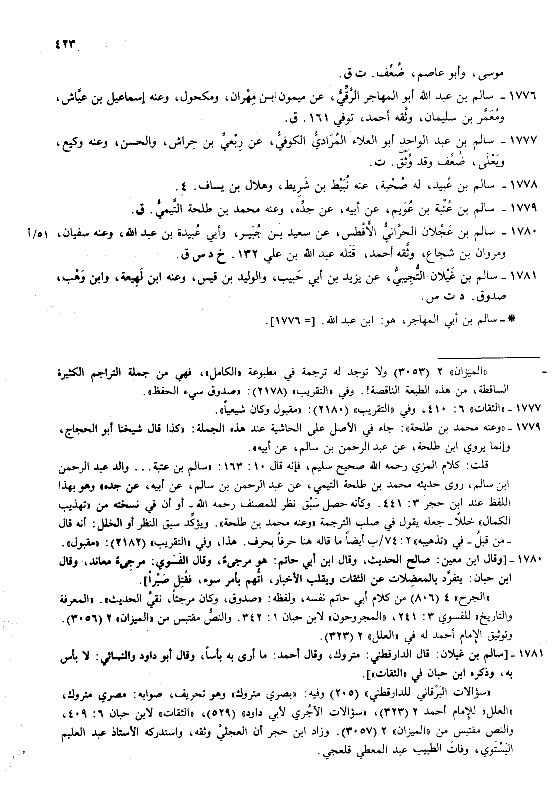 1777- سالم بن عبد الواحد أبو العلاء المرادي الكوفي عن ربعي بن حراش والحسن وعنه وكيع ويعلى ضعف وقد وثق حب ت