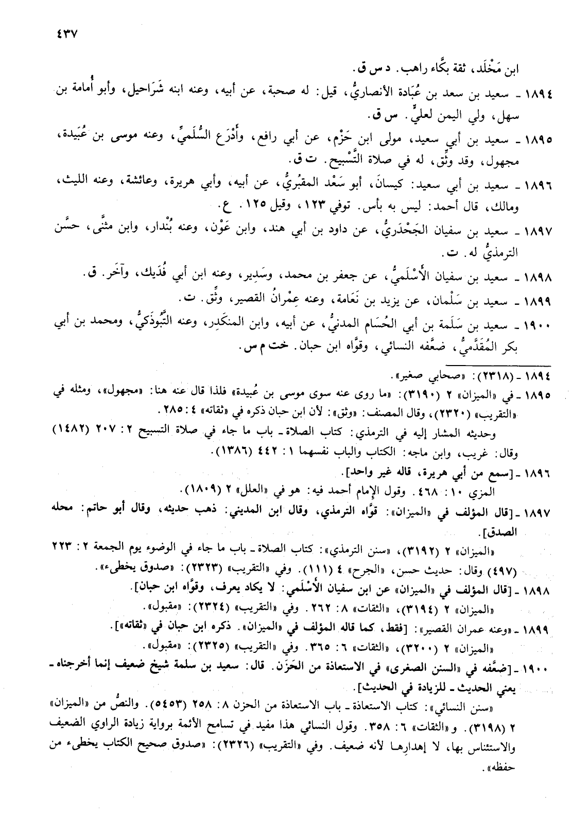 1895- سعيد بن أبي سعيد مولى بن حزم عن أبي رافع وأدرع السلمي وعنه موسى بن عبيدة مجهول وقد وثق له في صلاة التسبيح ت ق