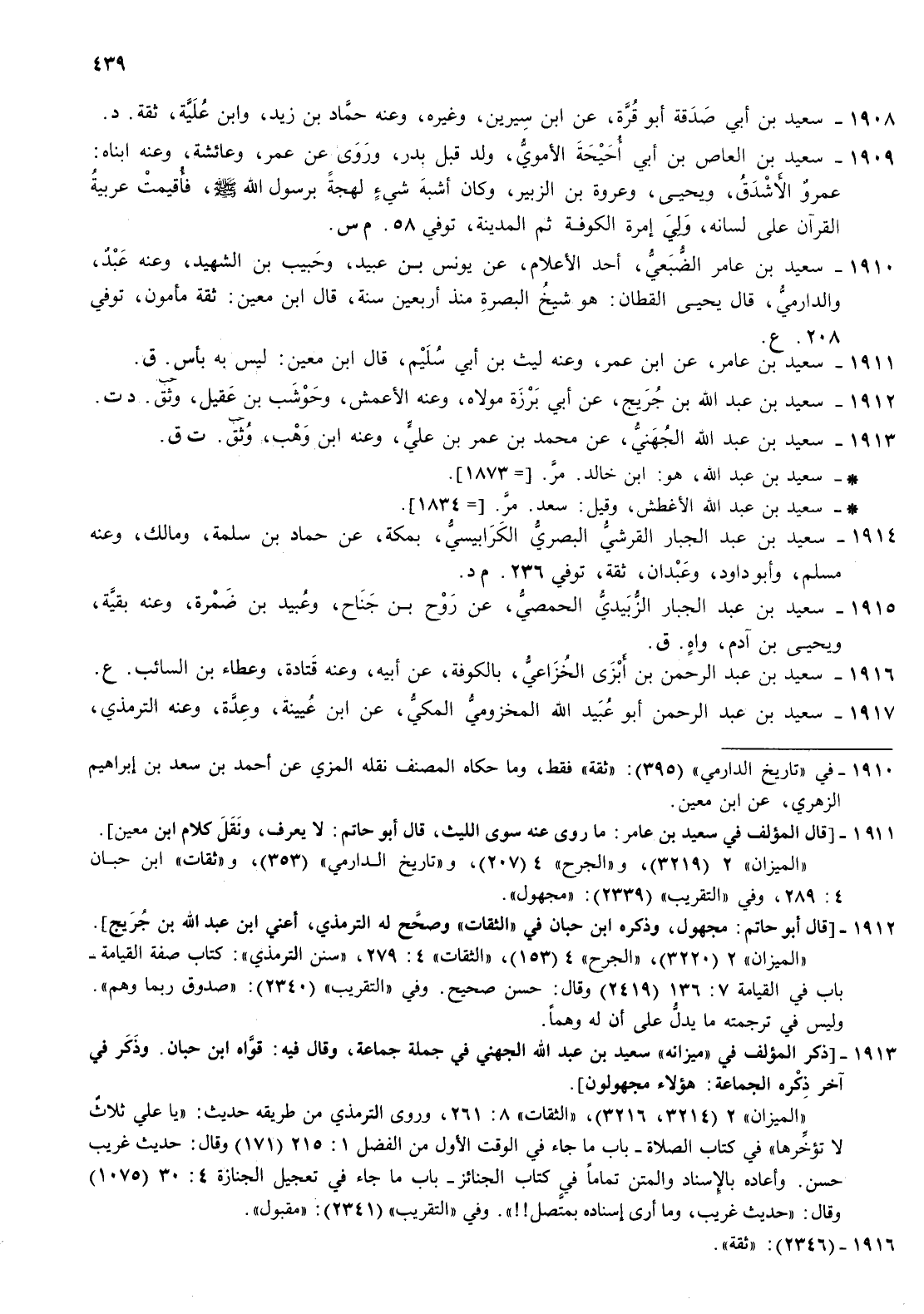 1910- سعيد بن عامر الضبعي أحد الاعلام عن يونس بن عبيد وحبيب بن الشهيد وعنه عبد والدارمي قال يحيى القطان هو شيخ البصرة منذ أربعين سنة قال بن معين ثقة مأمون توفي 208 ع