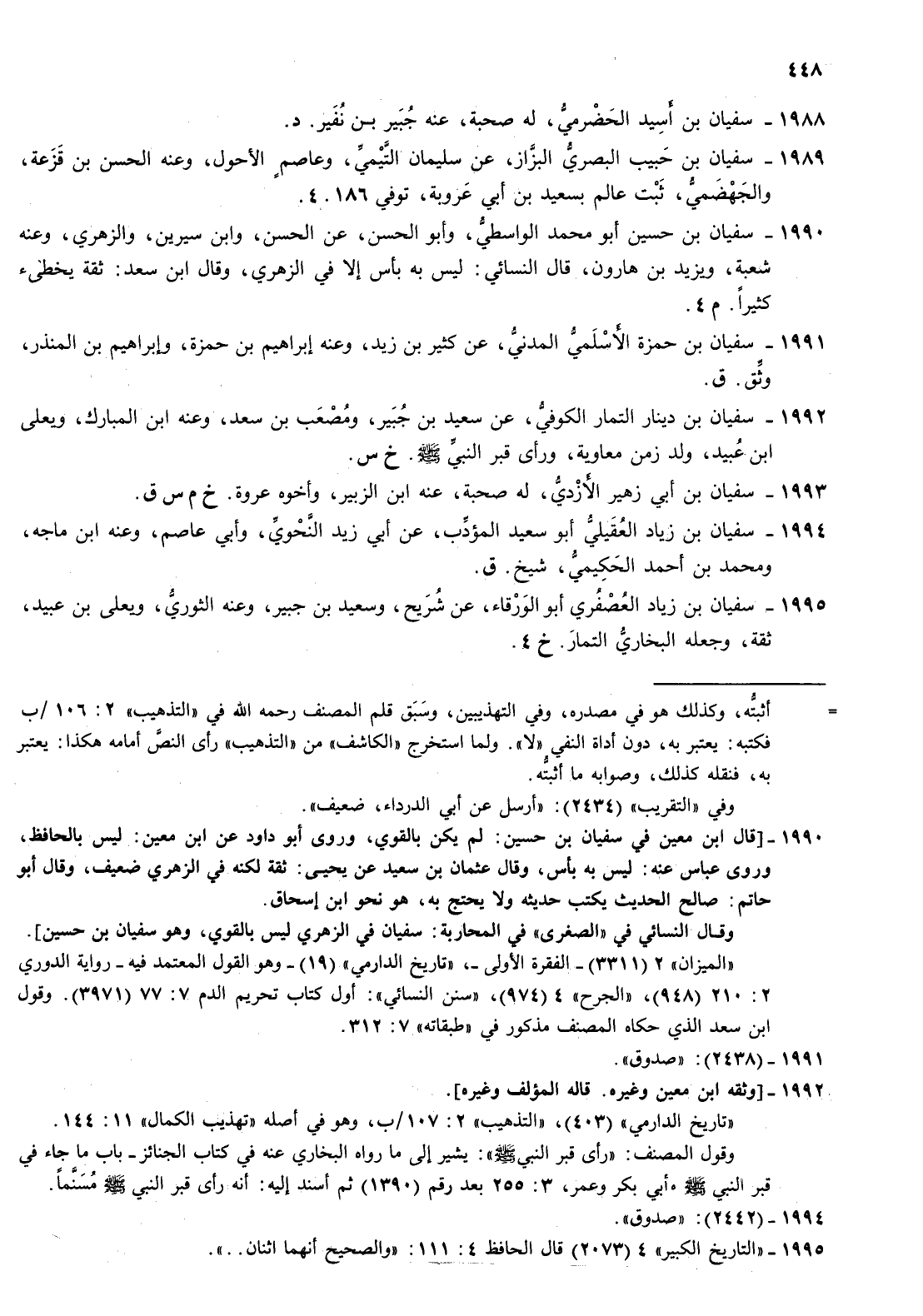 1992- سفيان بن دينار التمار الكوفي عن سعيد بن جبير ومصعب بن سعد وعنه بن المبارك ويعلى بن عبيد ولد زمن معاوية ورأى قبر النبي صلى الله عليه وسلم خ س