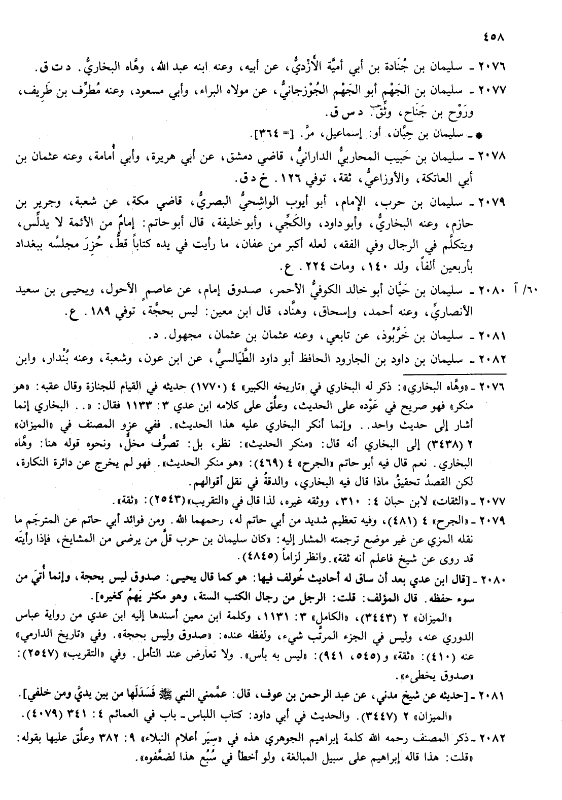 2078- سليمان بن حبيب المحاربي الداراني قاضي دمشق عن أبي هريرة وأبي أمامة وعنه عثمان بن أبي العاتكة والاوزاعي ثقة توفي 126 خ د ق