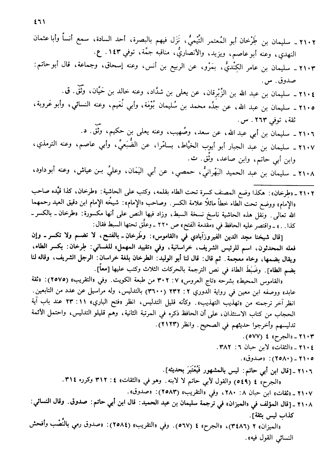2102- سليمان بن طرخان أبو المعتمر التيمي نزل فيهم بالبصرة أحد السادة سمع أنسا وأبا عثمان النهدي وعنه أبو عاصم ويزيد والانصاري مناقبه جمة توفي 143 ع